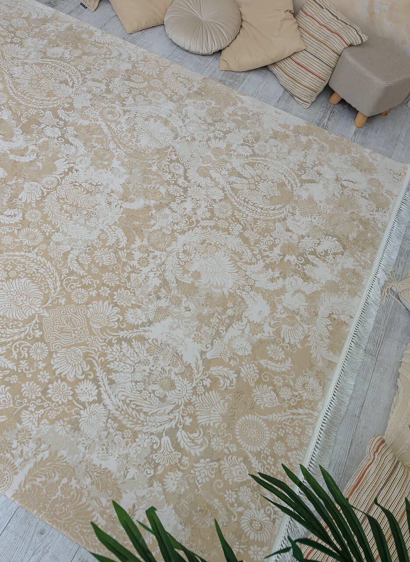 Турецький килим Kasmir Hazine, виготовлений з акрилу, вражає своєю високою щільністю та елегантним дизайном. Цей килим в світло-бежевих відтінках стане чудовим доповненням вашої спальні, вітальні або залу. Завдяки акриловому ворсу, який нагадує натуральну вовну, Kasmir Hazine має приємну на дотик структуру, що забезпечує тепло і м'якість.