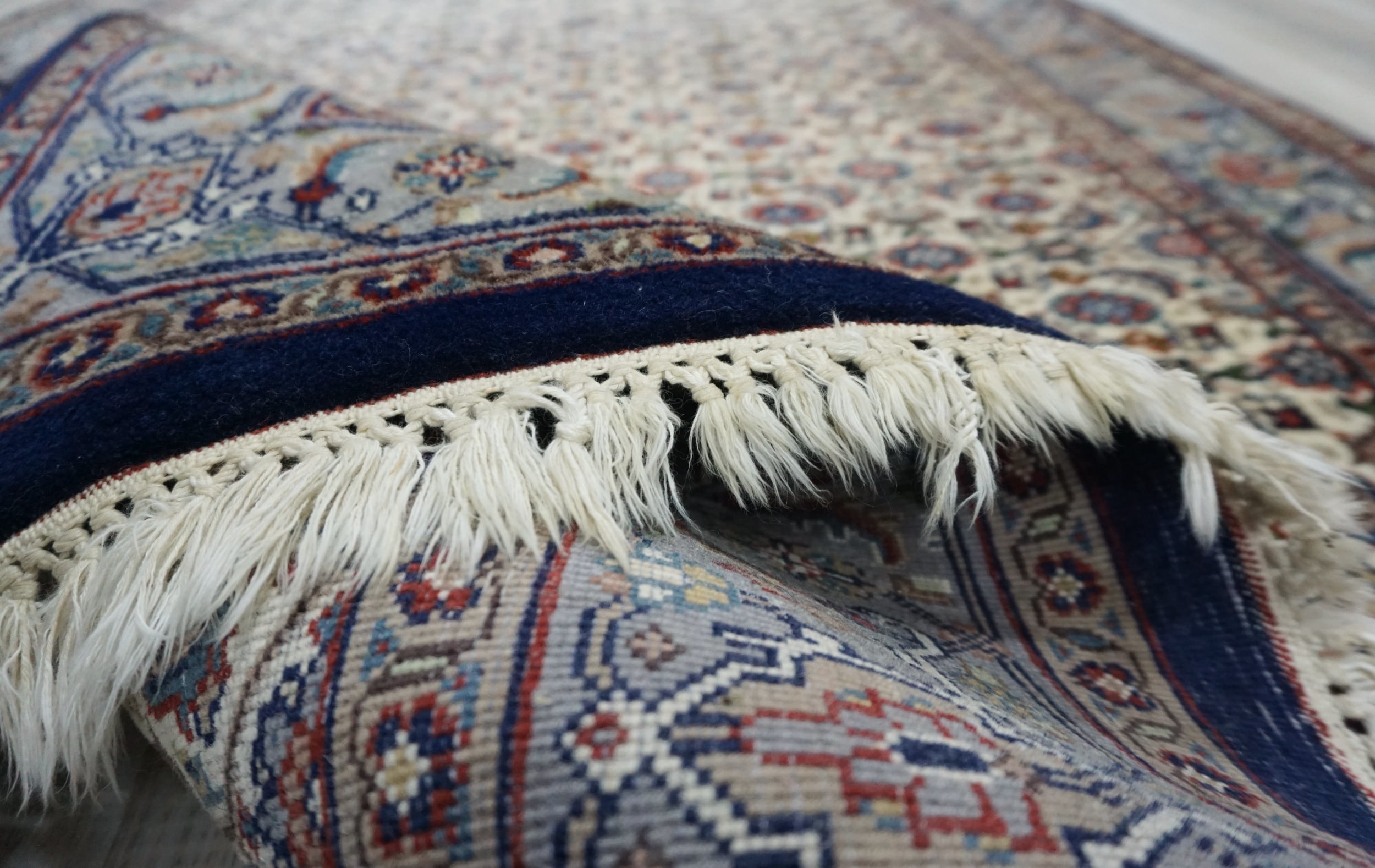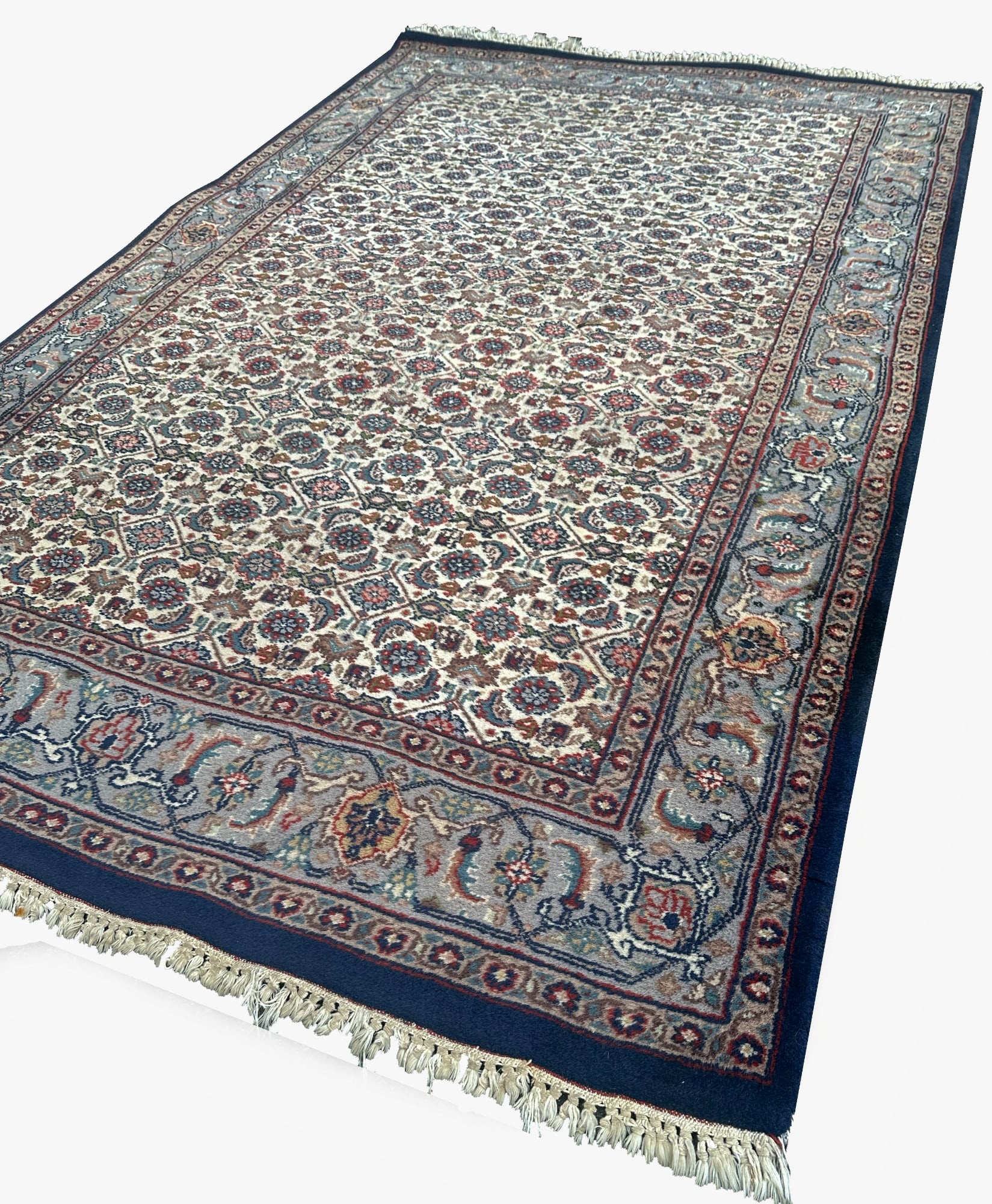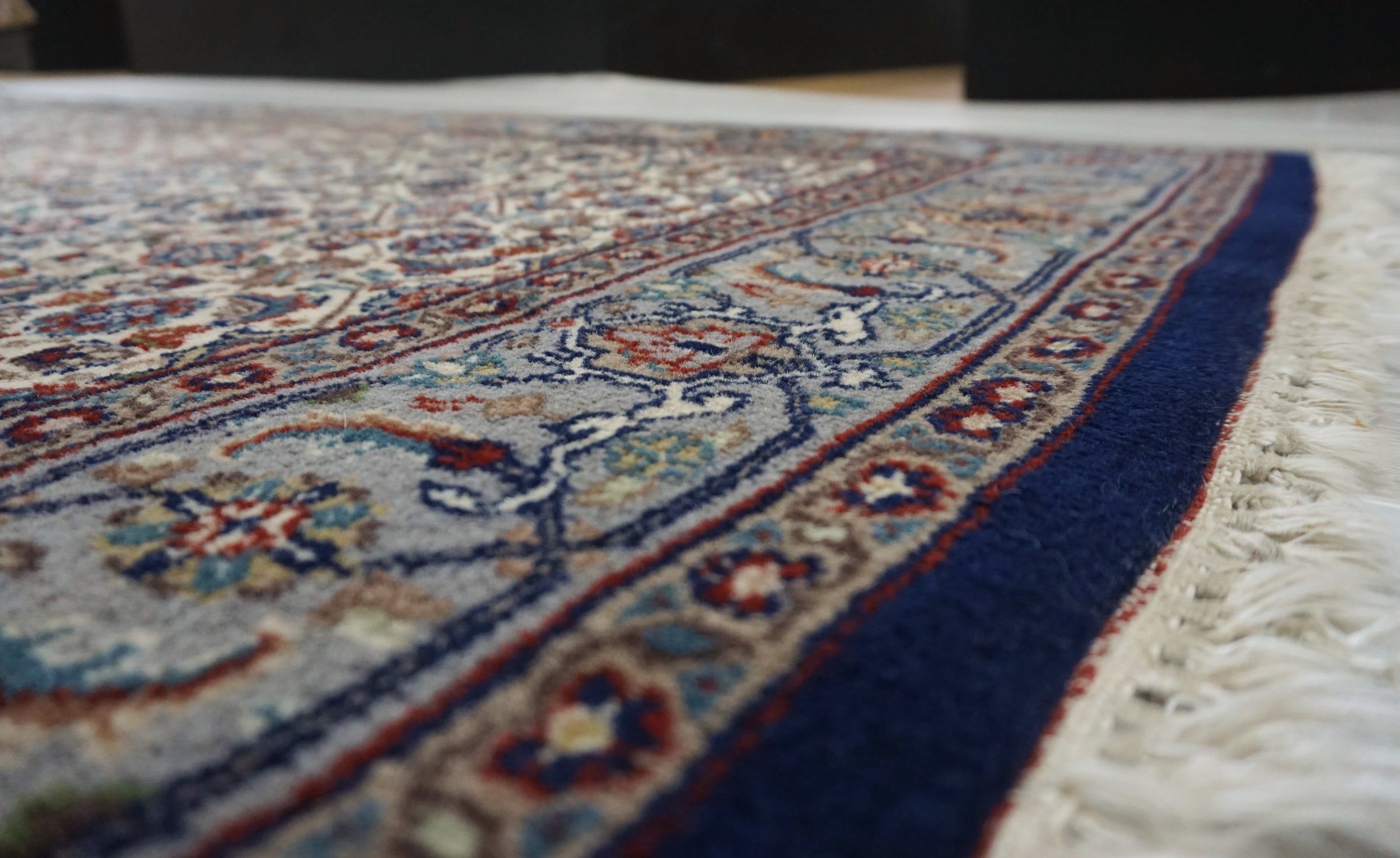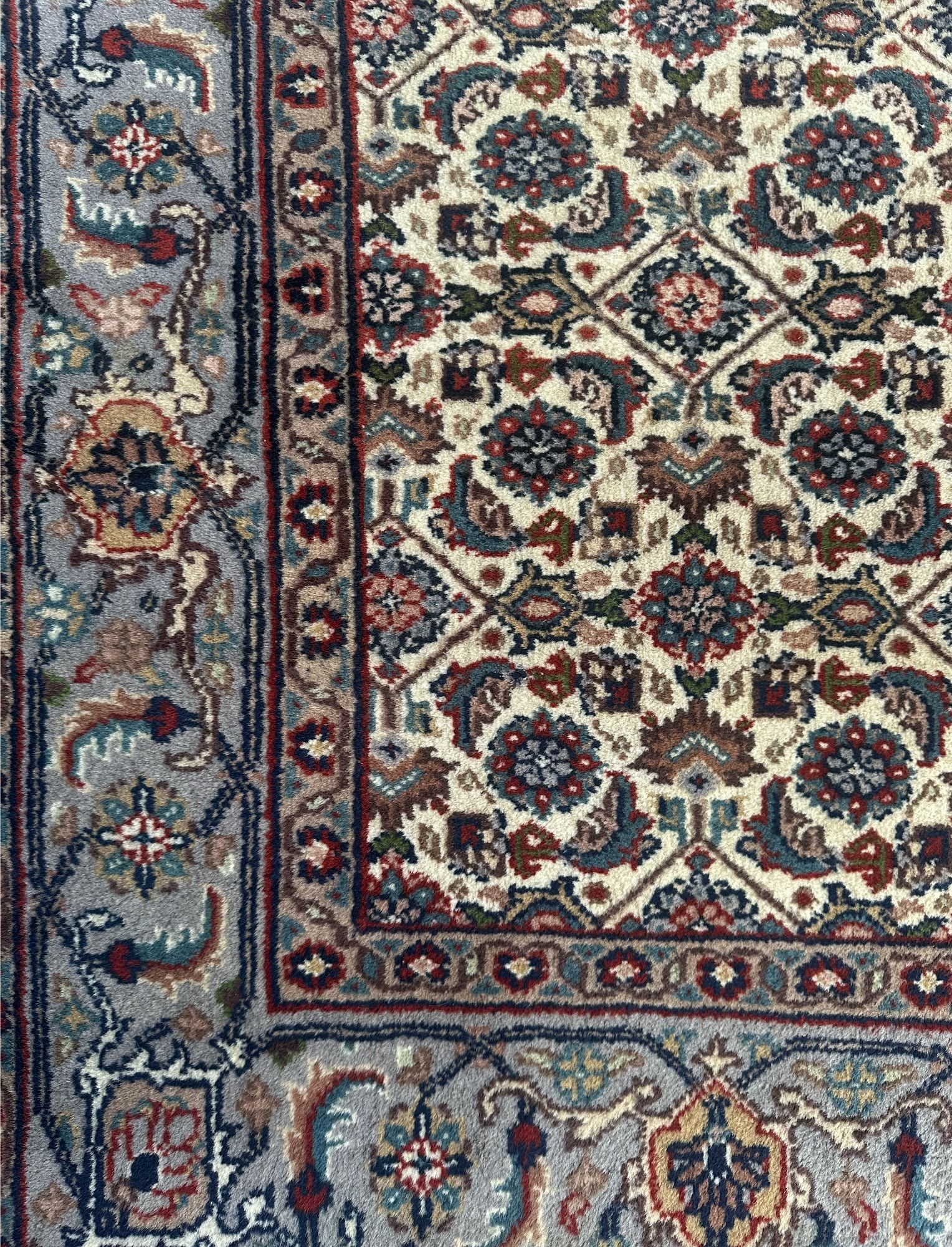 Класичний перський килим Keshan, виготовлений вручну у центральному Ірані. Тонке вузлування, вишуканий орнамент із квітковими мотивами та гармонійна кольорова гама — усе це робить його справжнім зразком перського ткацького мистецтва. Основу становить бавовна, ворс — високоякісна вовна, що забезпечує м’якість і приємний блиск. Килим відзначається дрібним повторюваним візерунком на світлому полі та глибоким синьо-сірим бордюром із традиційними квітковими елементами. Килим має вік близько 60 років, перебуває у чудовому стані — чистий, доглянутий, без пошкоджень.