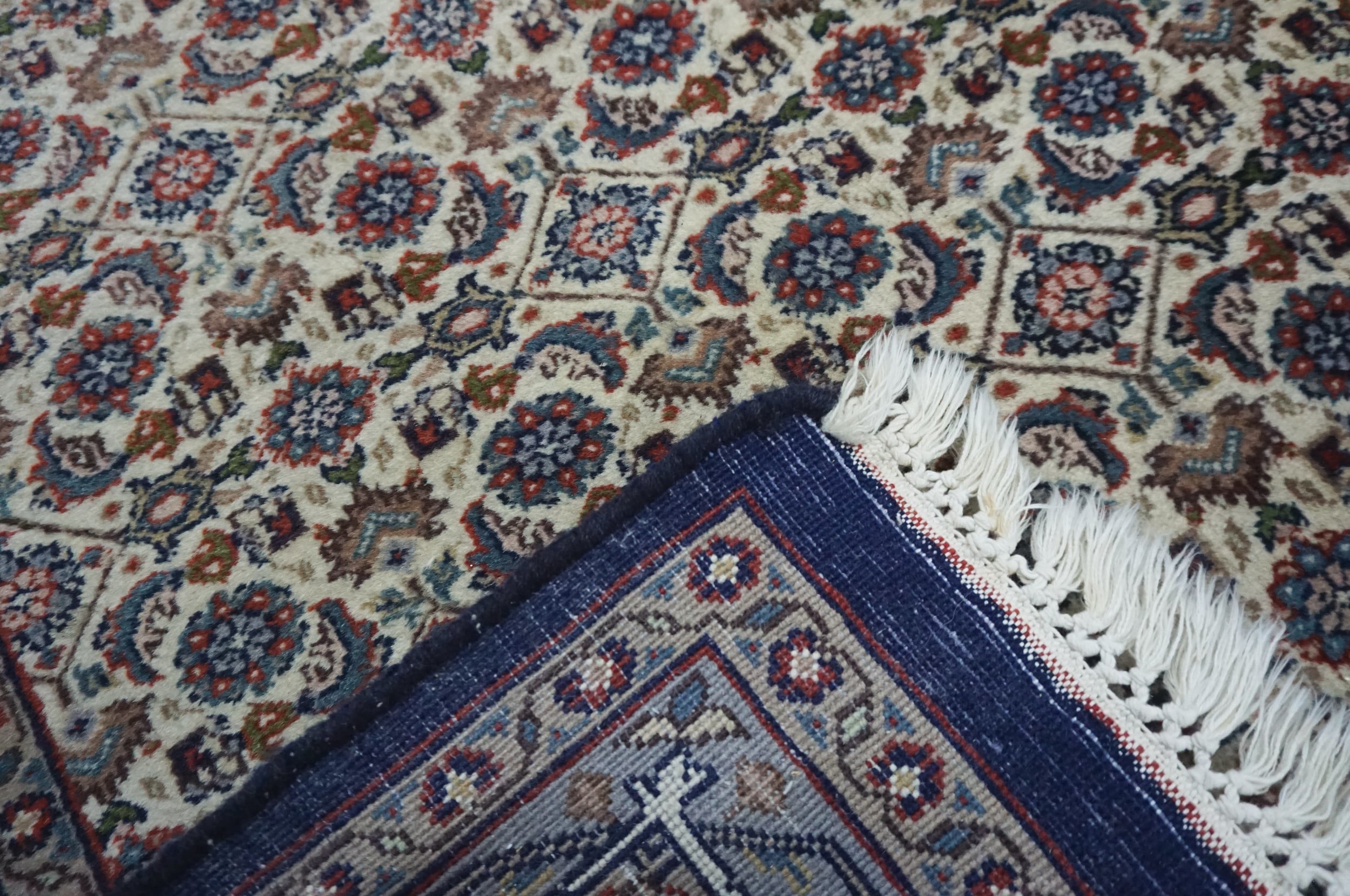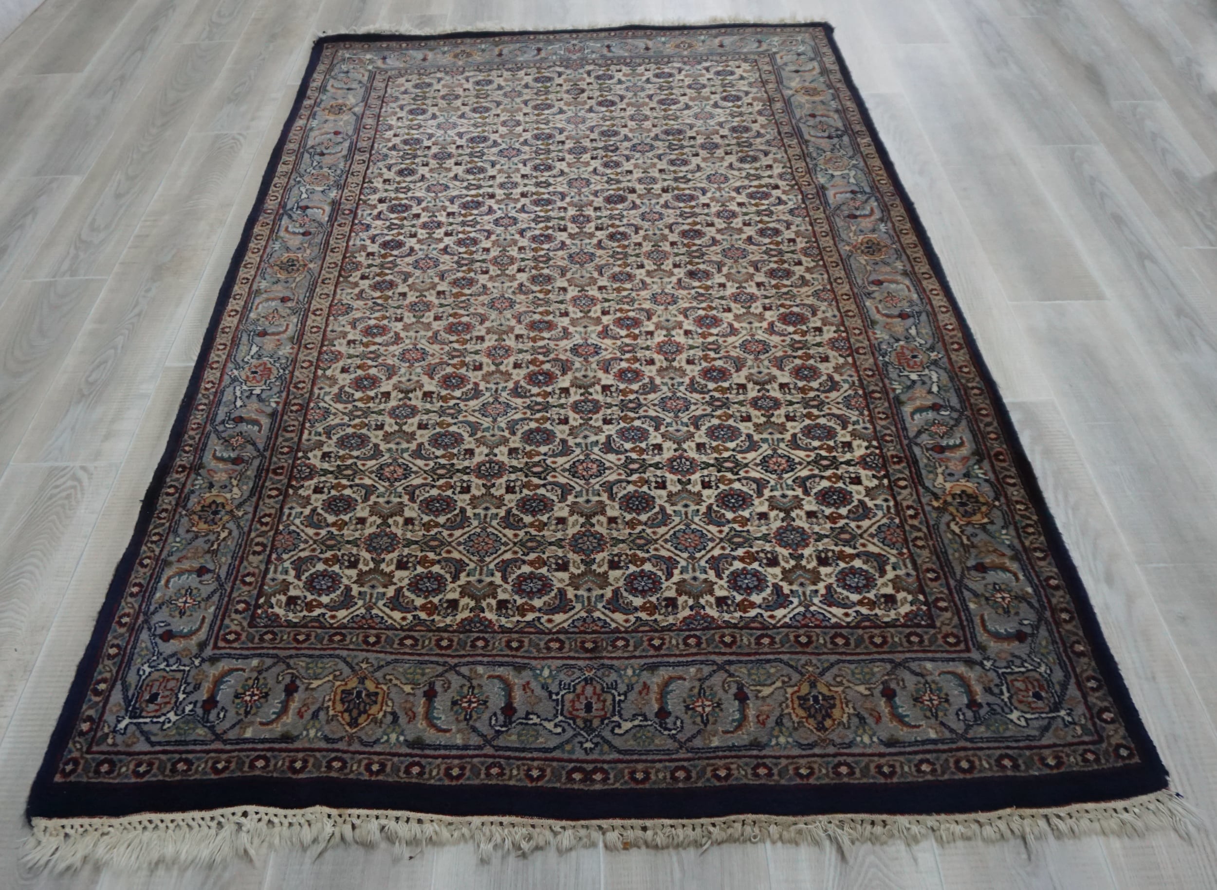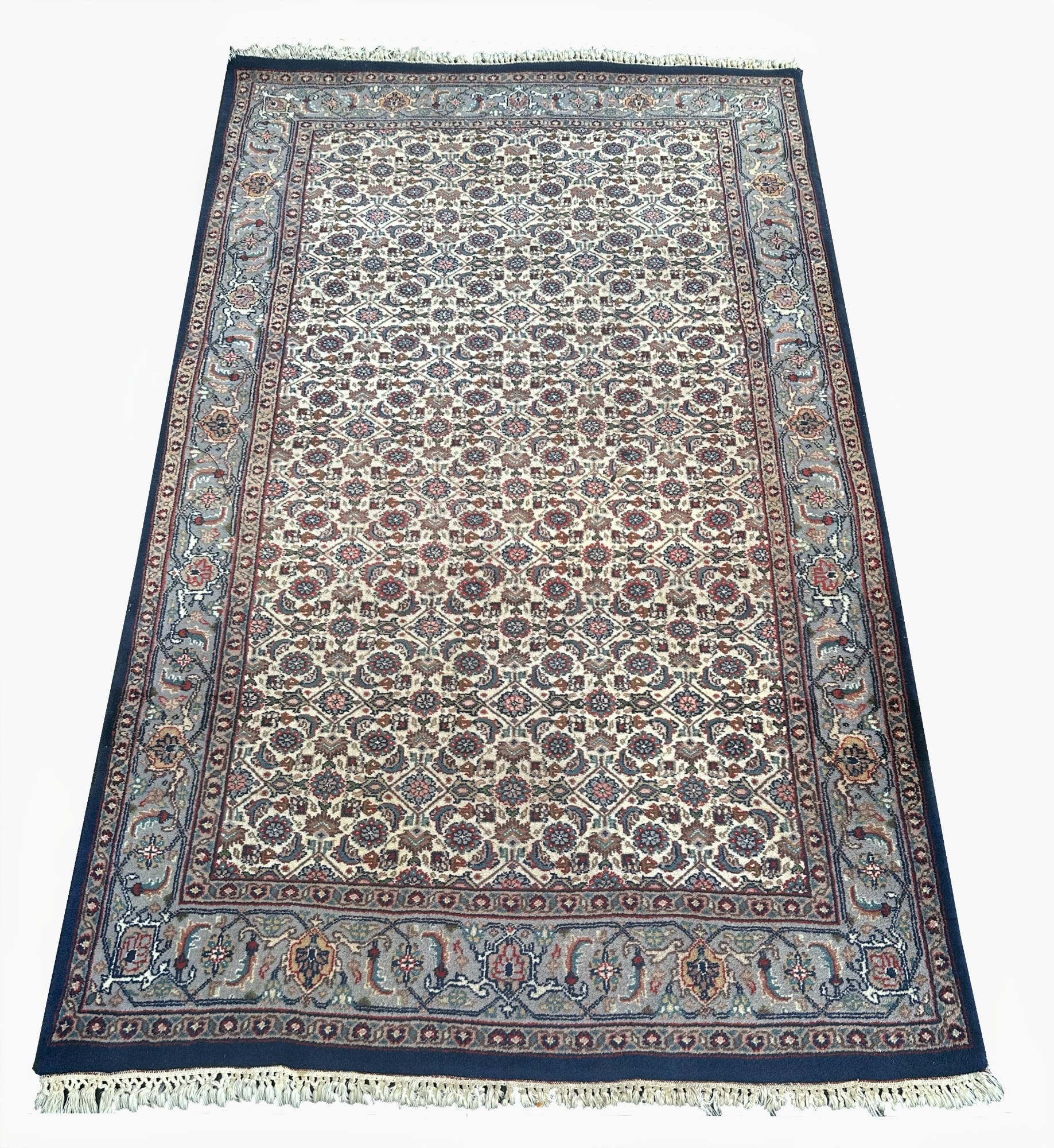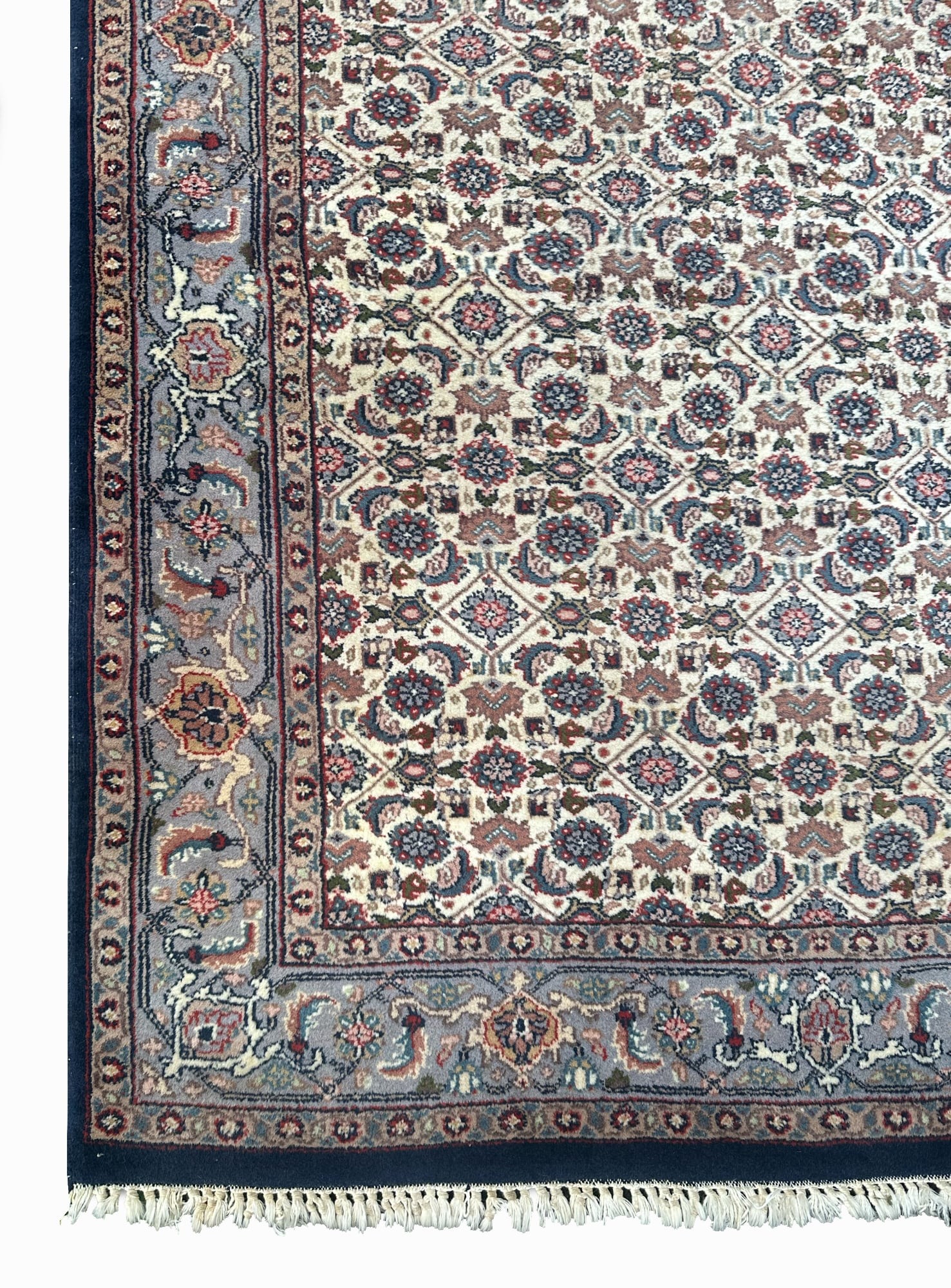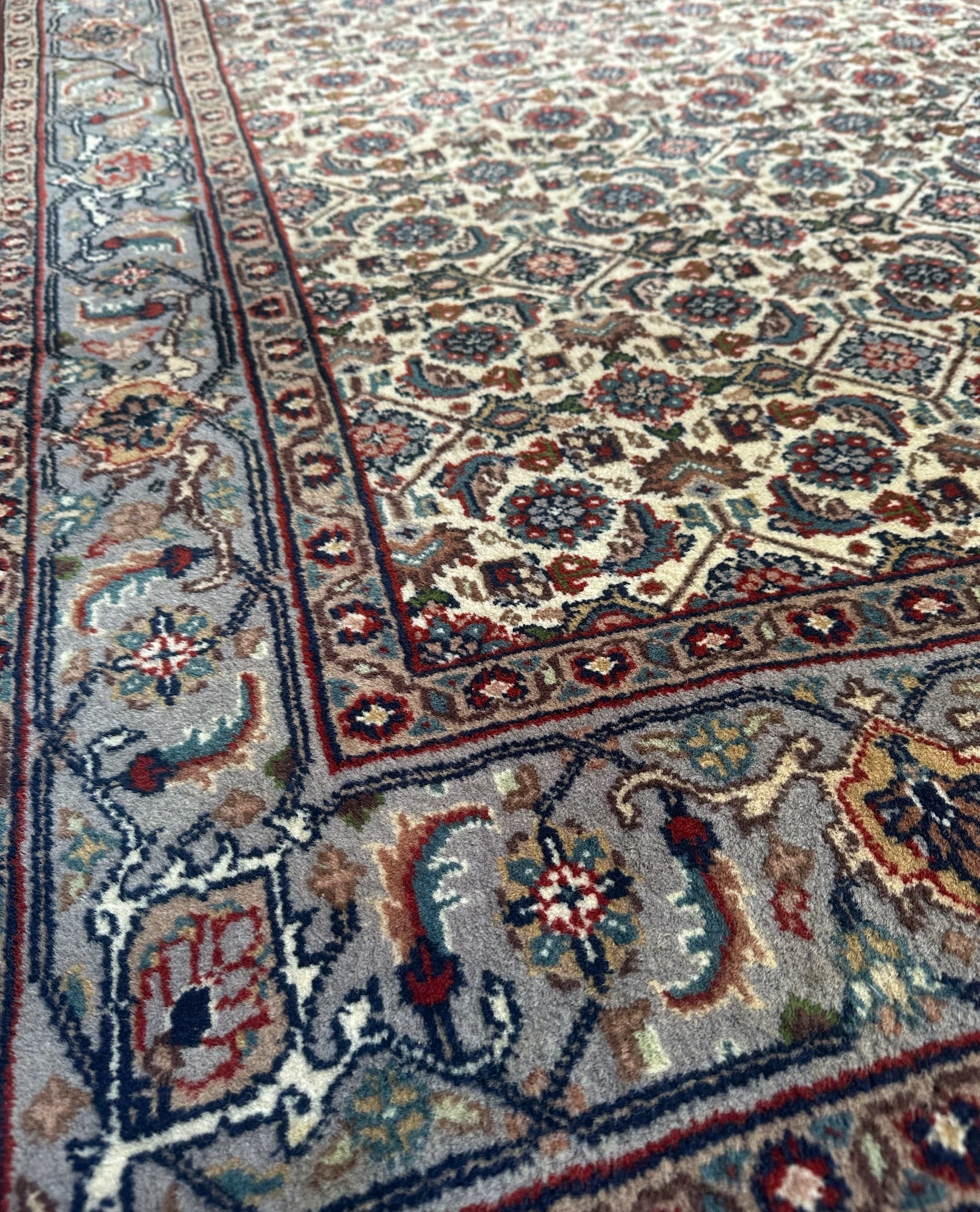 Класичний перський килим Keshan, виготовлений вручну у центральному Ірані. Тонке вузлування, вишуканий орнамент із квітковими мотивами та гармонійна кольорова гама — усе це робить його справжнім зразком перського ткацького мистецтва. Основу становить бавовна, ворс — високоякісна вовна, що забезпечує м’якість і приємний блиск. Килим відзначається дрібним повторюваним візерунком на світлому полі та глибоким синьо-сірим бордюром із традиційними квітковими елементами. Килим має вік близько 60 років, перебуває у чудовому стані — чистий, доглянутий, без пошкоджень.