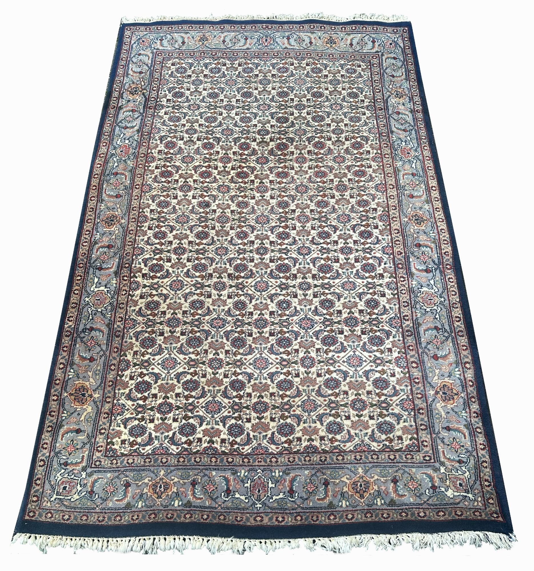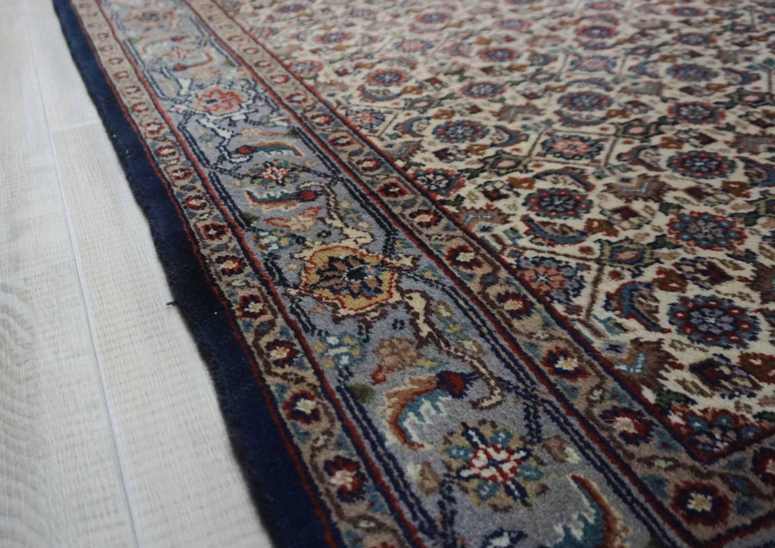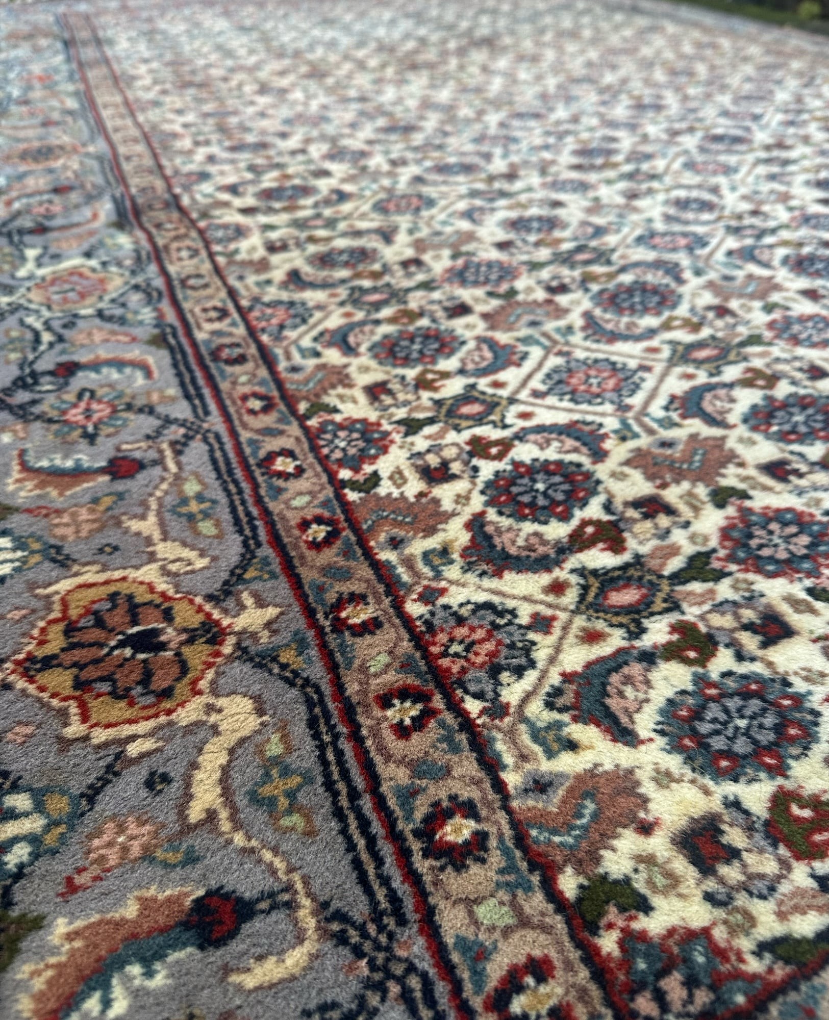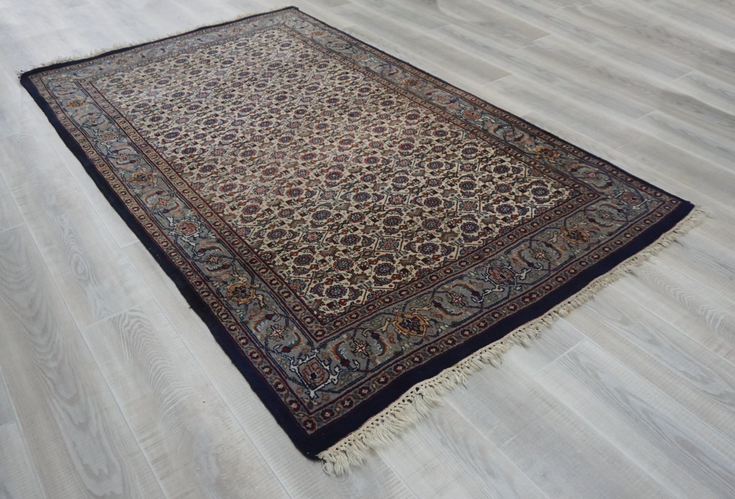 Класичний перський килим Keshan, виготовлений вручну у центральному Ірані. Тонке вузлування, вишуканий орнамент із квітковими мотивами та гармонійна кольорова гама — усе це робить його справжнім зразком перського ткацького мистецтва. Основу становить бавовна, ворс — високоякісна вовна, що забезпечує м’якість і приємний блиск. Килим відзначається дрібним повторюваним візерунком на світлому полі та глибоким синьо-сірим бордюром із традиційними квітковими елементами. Килим має вік близько 60 років, перебуває у чудовому стані — чистий, доглянутий, без пошкоджень.