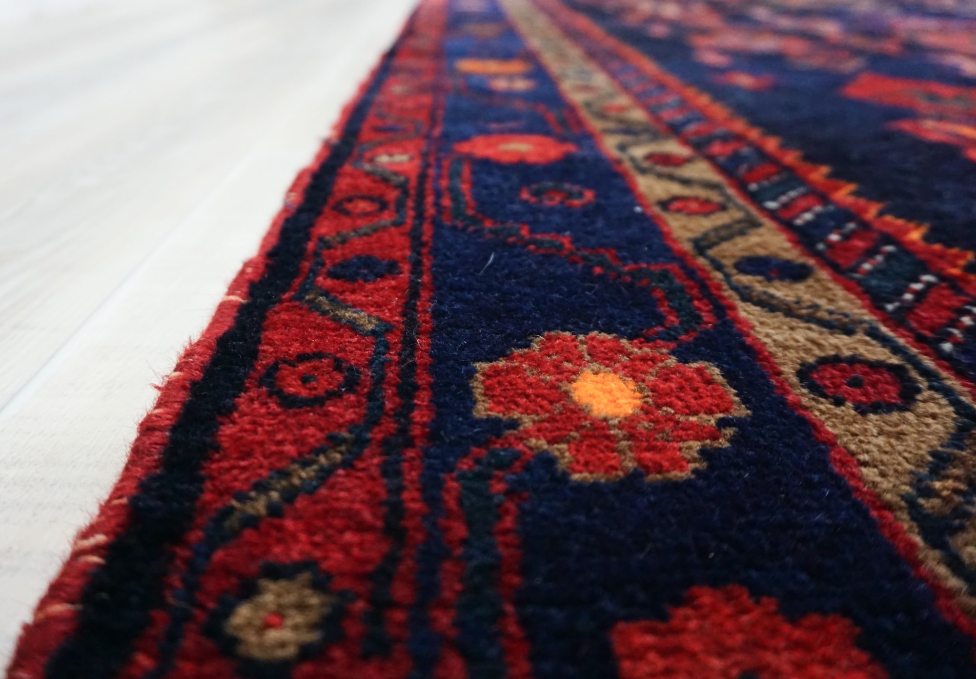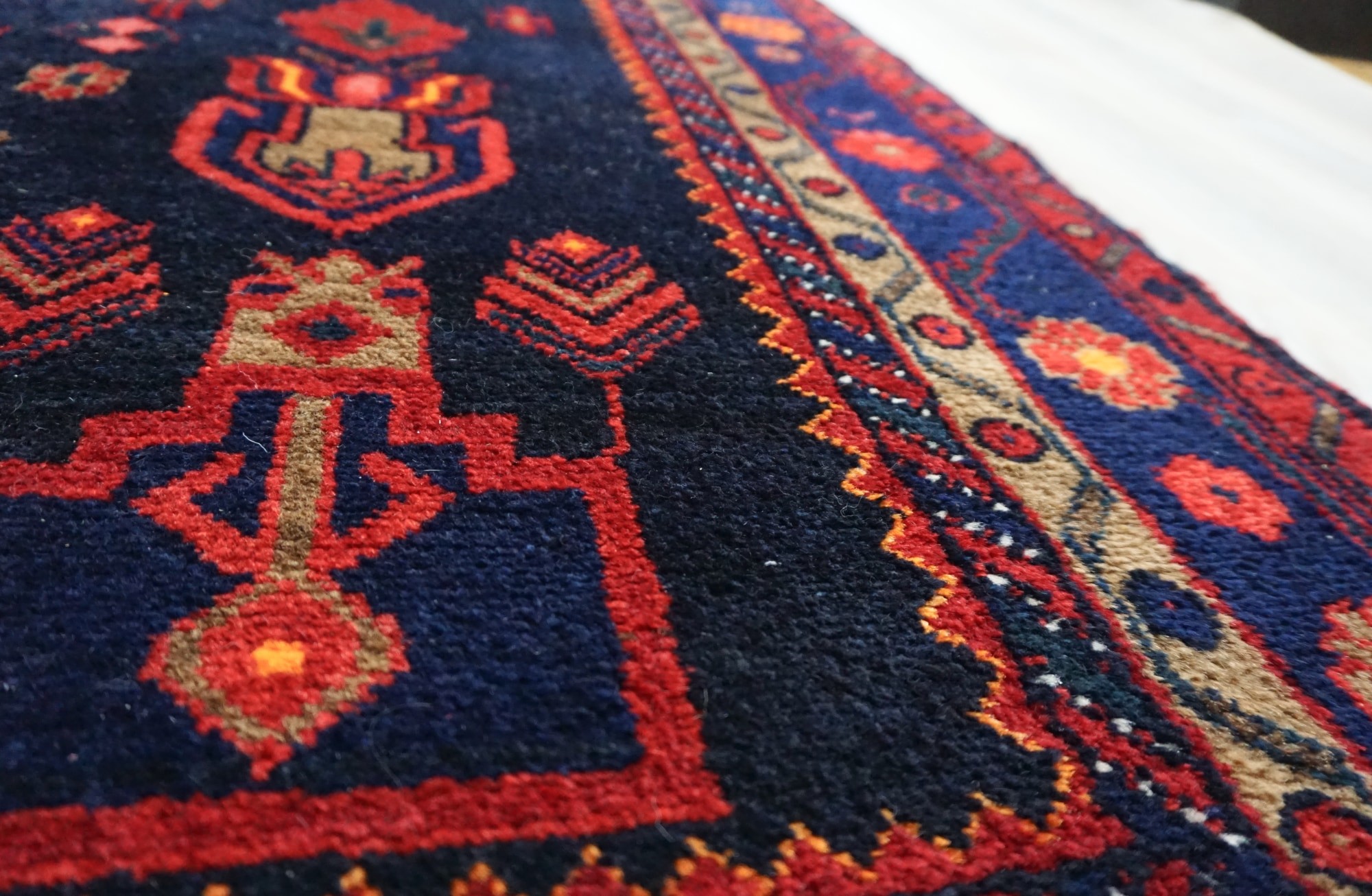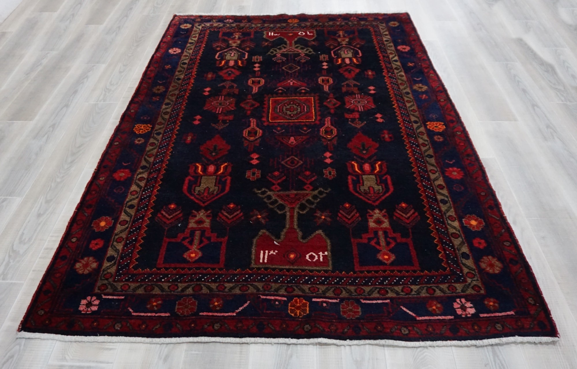 Этот аутентичный ковер Baluch соткан вручную кочевыми мастерами на востоке Ирана. Для него характерны глубокие оттенки тёмно-синего, красного и бордового цветов, создающие выразительный геометрический орнамент с традиционными мотивами — деревом жизни, ромбами и стилизованными цветами.
