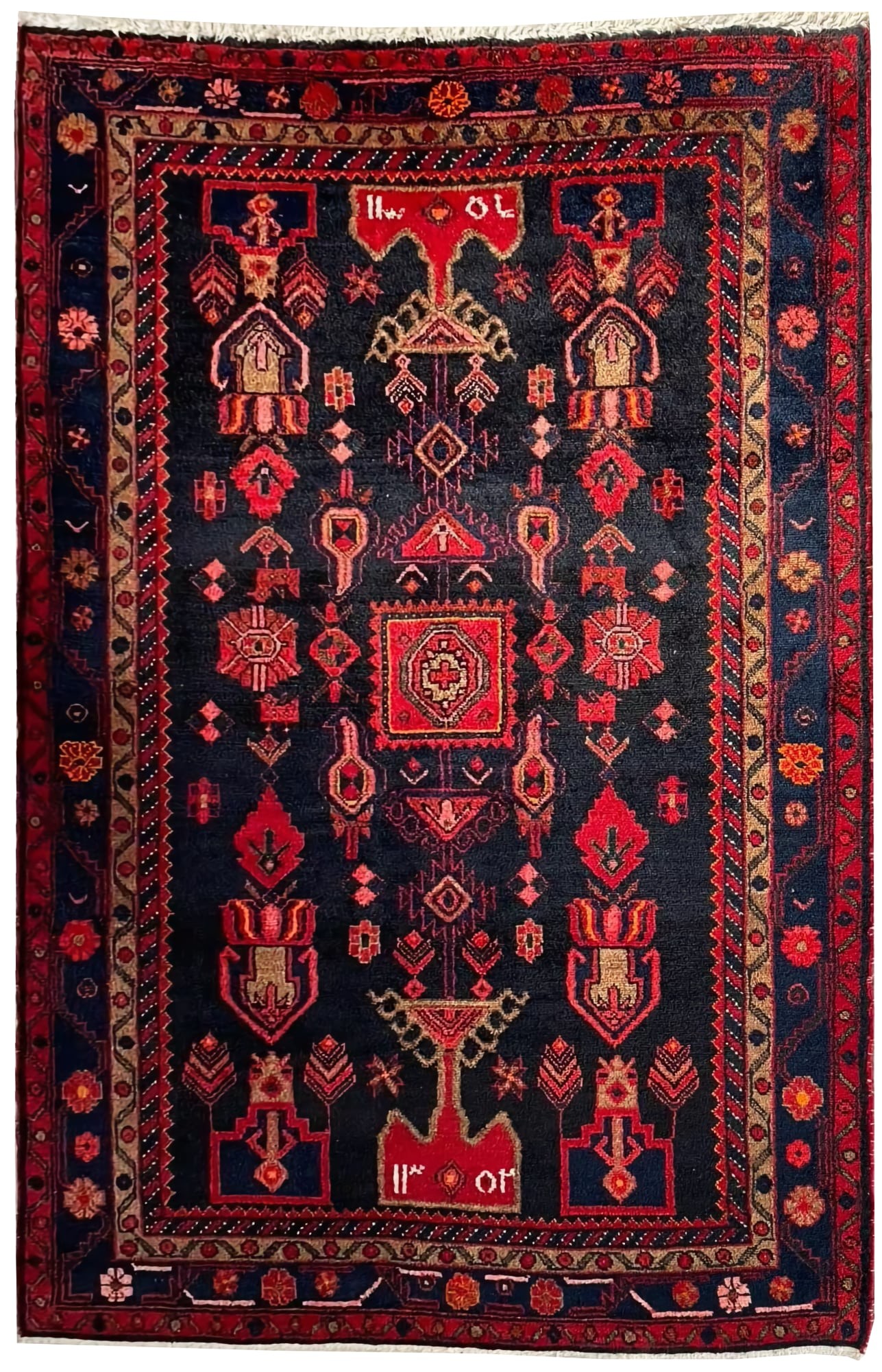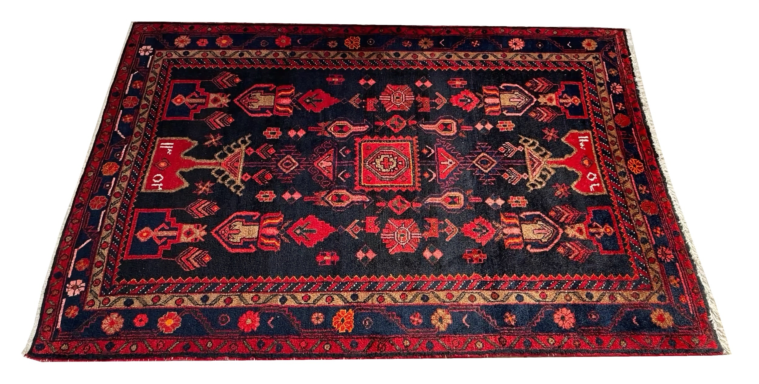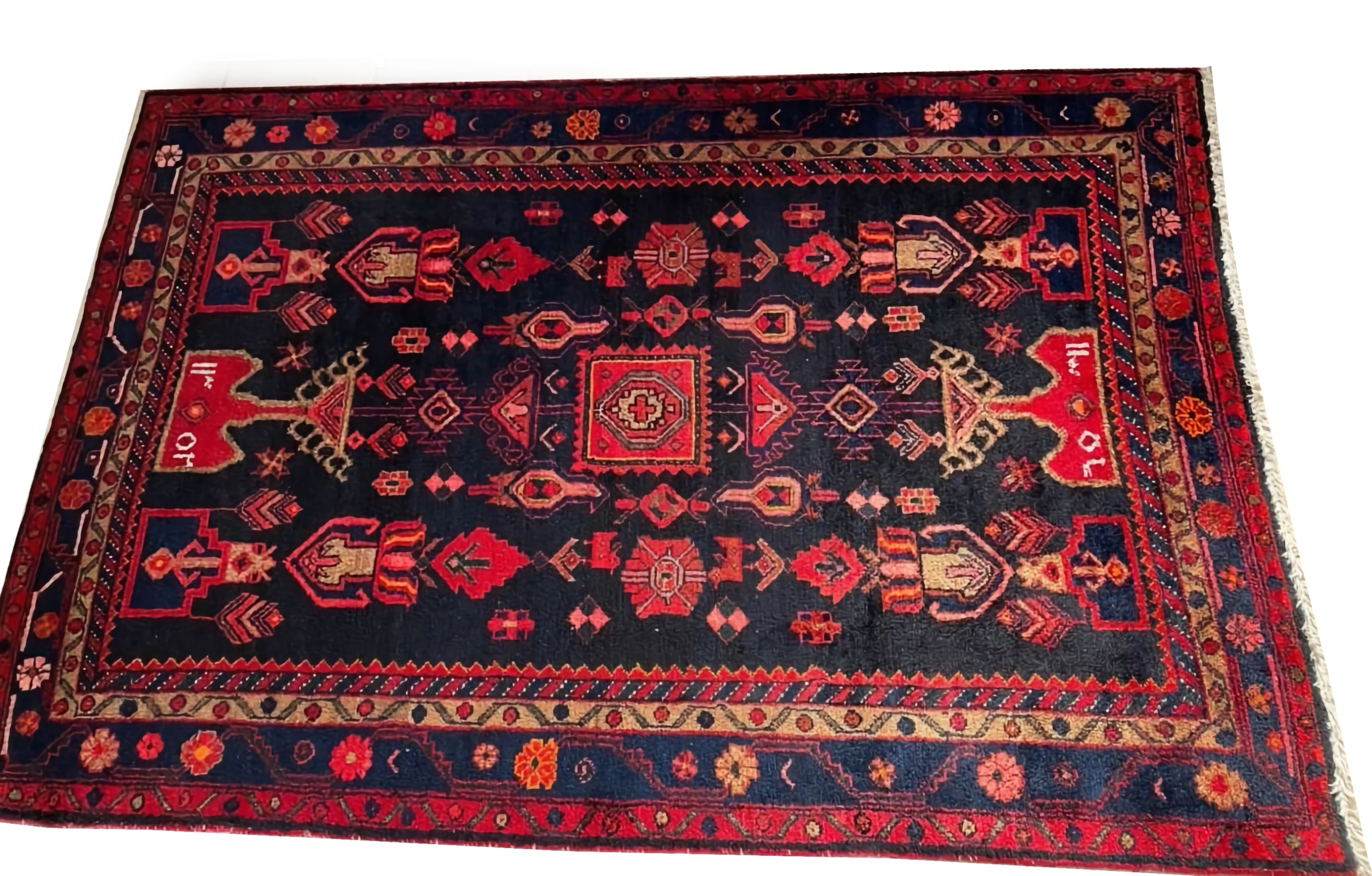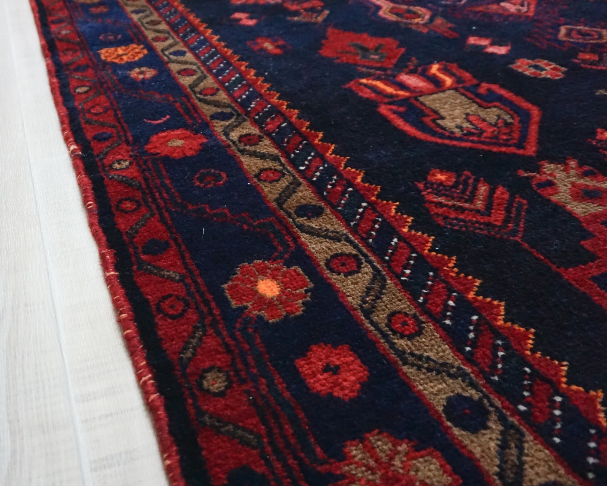Этот аутентичный ковер Baluch соткан вручную кочевыми мастерами на востоке Ирана. Для него характерны глубокие оттенки тёмно-синего, красного и бордового цветов, создающие выразительный геометрический орнамент с традиционными мотивами — деревом жизни, ромбами и стилизованными цветами.