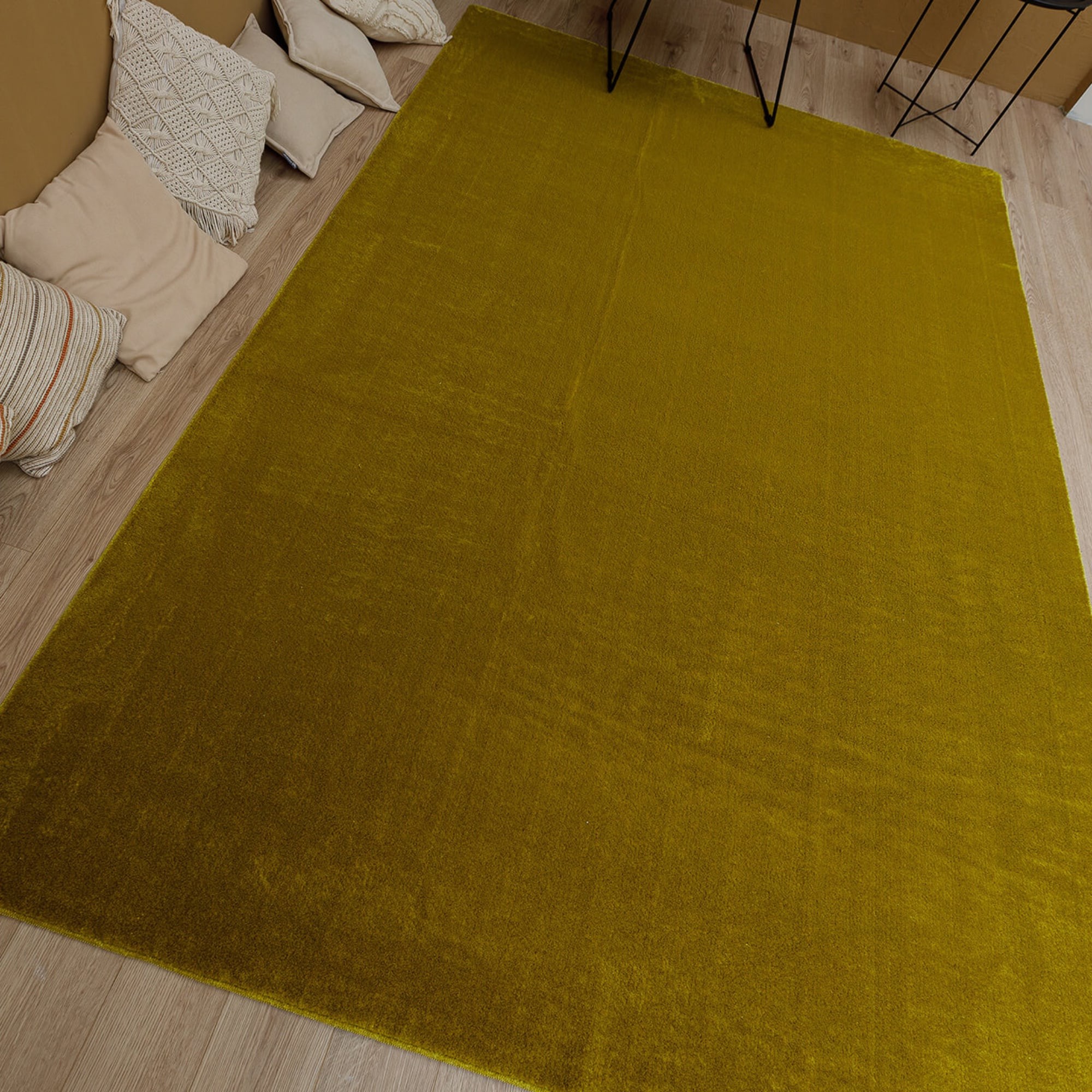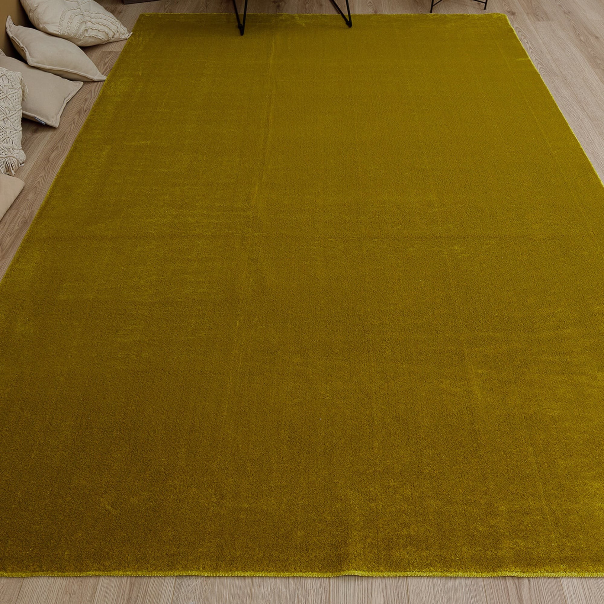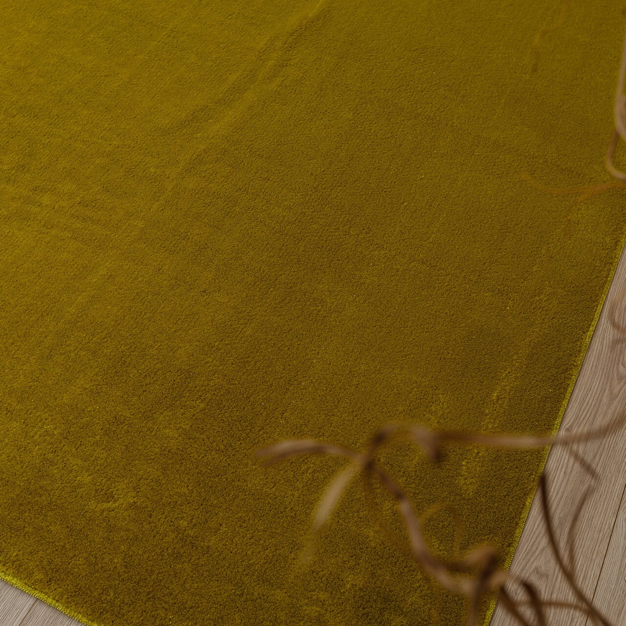 Ковер изготовлен из мягкого синтетического ворса, приятного на ощупь и простого в уходе. Однотонная поверхность подчеркивает чистоту линий и позволяет акцентировать внимание на мебели и декоре.