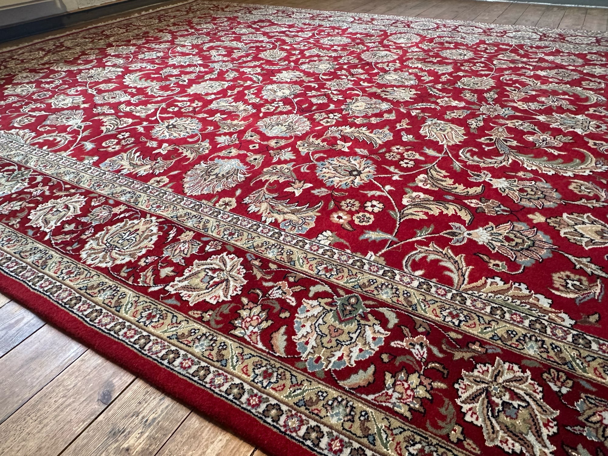Цветовая палитра ковра поражает своей глубиной. Основой служит насыщенный, благородный рубиново-красный цвет (оттенок Dark Cherry), на котором расцветает сложный ботанический орнамент. Узор выполнен в стиле "all-over" (сплошное поле без центрального медальона), что делает его универсальным для размещения мебели. Изящные цветочные мотивы, пальметты и вьющиеся лозы детализированы кремовыми, шалфейными и приглушенными синими оттенками, создавая богатую, но гармоничную композицию.