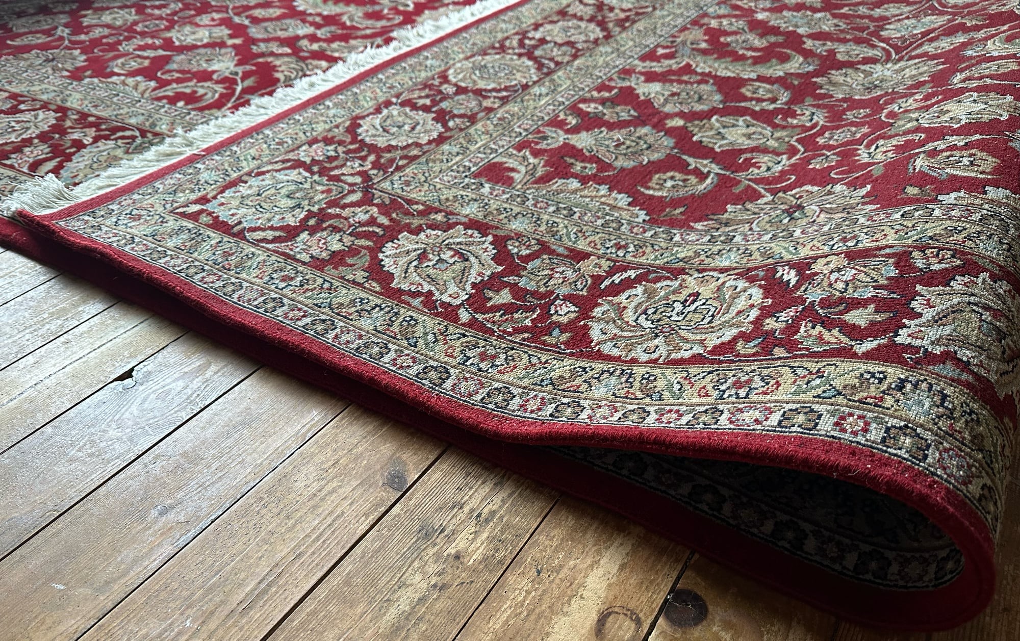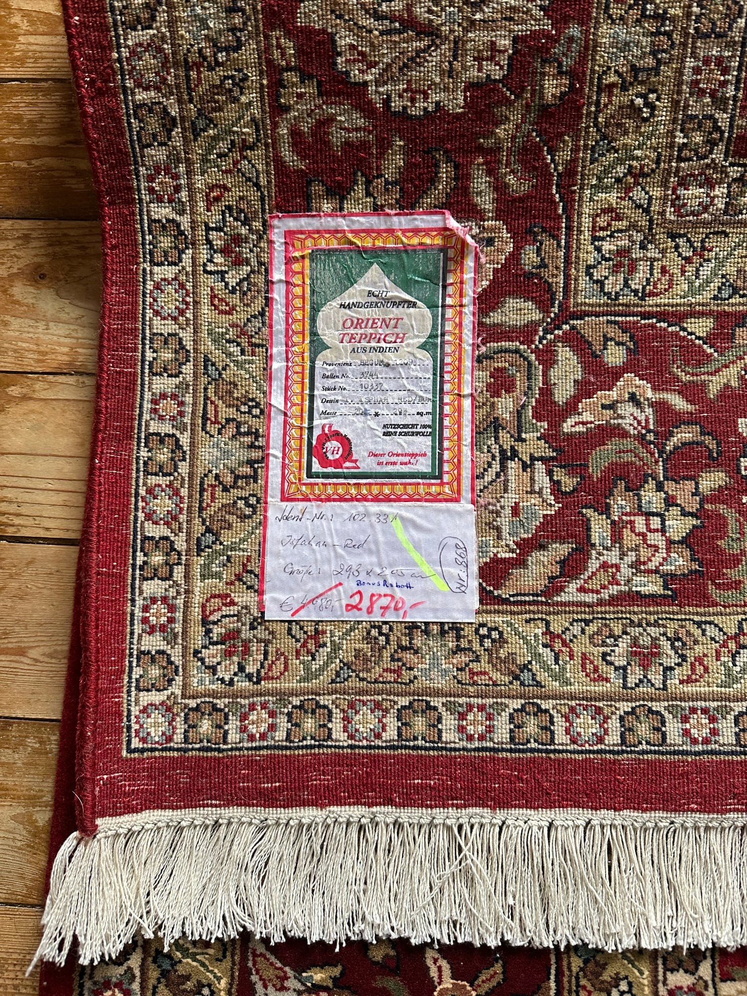 Качество материалов подтверждено оригинальной этикеткой: ворс изготовлен из 100% чистой натуральной шерсти (Reine Schurwolle). Это обеспечивает ковру мягкость, теплоизоляцию и чрезвычайную долговечность. Ковер находится в отличном состоянии, имеет густой плотный ворс и сохраненную бахрому. Благодаря размеру почти 3х2 метра, он идеально подойдет для гостиной, кабинета или просторной столовой.