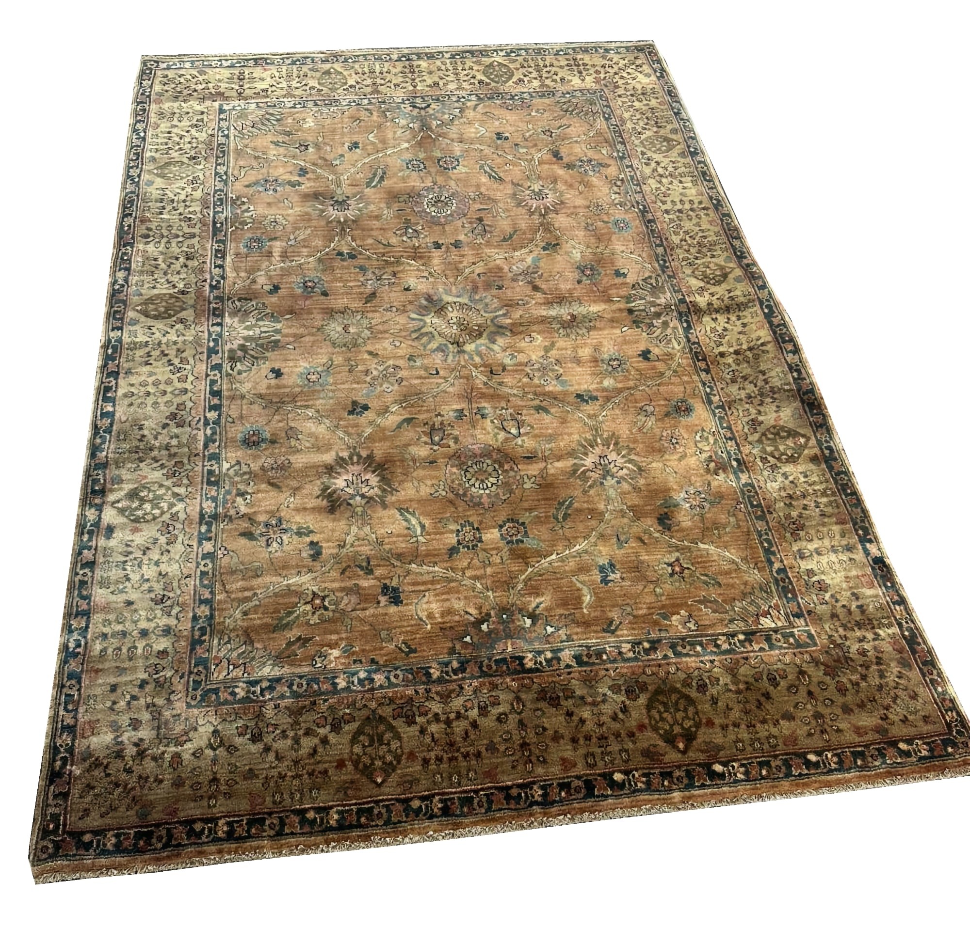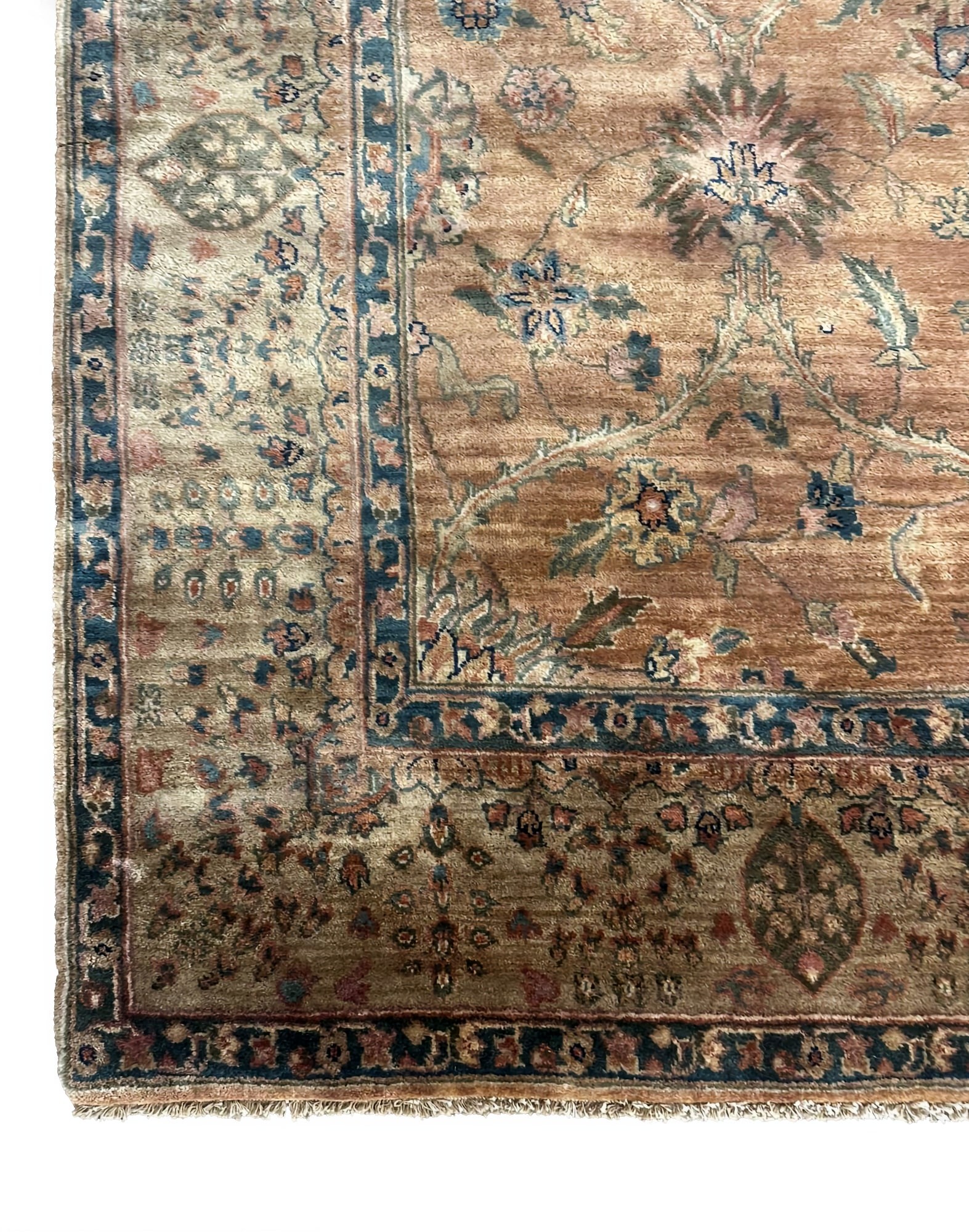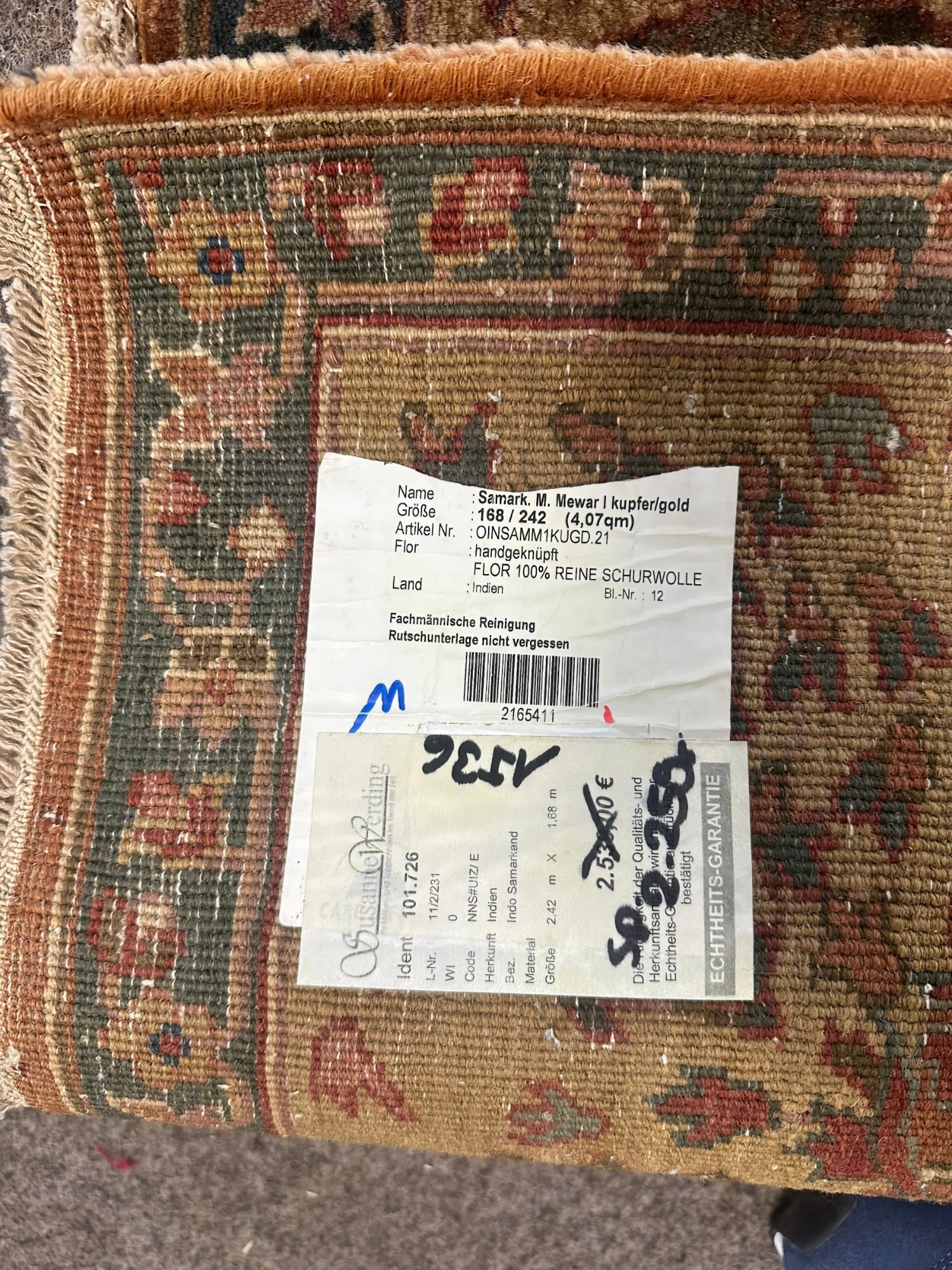 Цветовая гамма: На бирке указано "Kupfer / Gold" (Медный / Золотой). В реальности это выглядит как очень благородный, пастельный оттенок: смесь теплого песочного, золотисто-бежевого и мягкого терракотового. Такой цвет часто называют "Camel" или "Antique Gold". Он создает в комнате атмосферу тепла и света. Узор: Дизайн "Mewar" — это сплошной цветочный орнамент (Allover) с крупными, изящными бутонами и переплетенными лозами в нежно-голубых и серых тонах. Отсутствие центрального медальона делает дизайн воздушным и просторным. Эффект: Ковер имеет легкий эффект "Vintage Wash" (состаривания), что сейчас на пике популярности. Он не выглядит новым и ярким, а обладает шармом антикварной вещи.