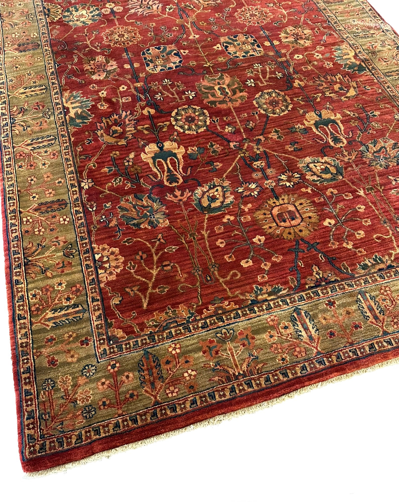 Поле ковра: Благородный оттенок "Faded Terracotta" (Выцветшая Терракота) или мягкий медный цвет. Поверхность имеет выразительный эффект "абраш" (игра полутонов), что придает изделию вид дорогого антиквариата, который благородно состарился. Контрастные акценты: Уголки (spandrels) и элементы бордюра выполнены в сложном цвете "Teal" (Цвет морской волны / Глубокий сине-зеленый). Это сочетание теплой терракоты и прохладной бирюзы является одним из самых гармоничных в дизайне интерьеров. Узор: Классическая медальонная композиция. Большой центральный медальон в песочно-бежевых тонах с геометрическими элементами символизирует солнце или вселенную и фокусирует взгляд на центре помещения.