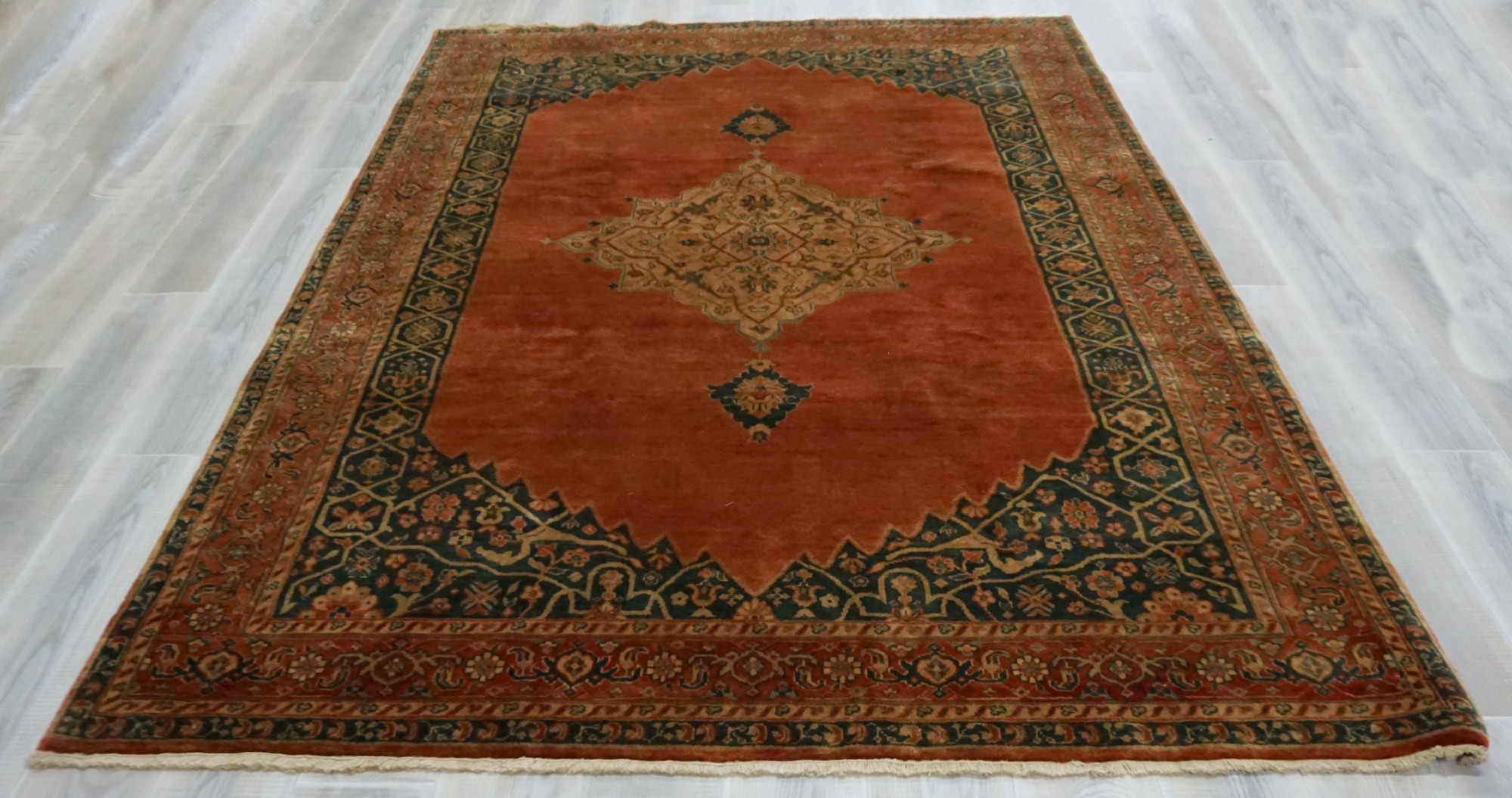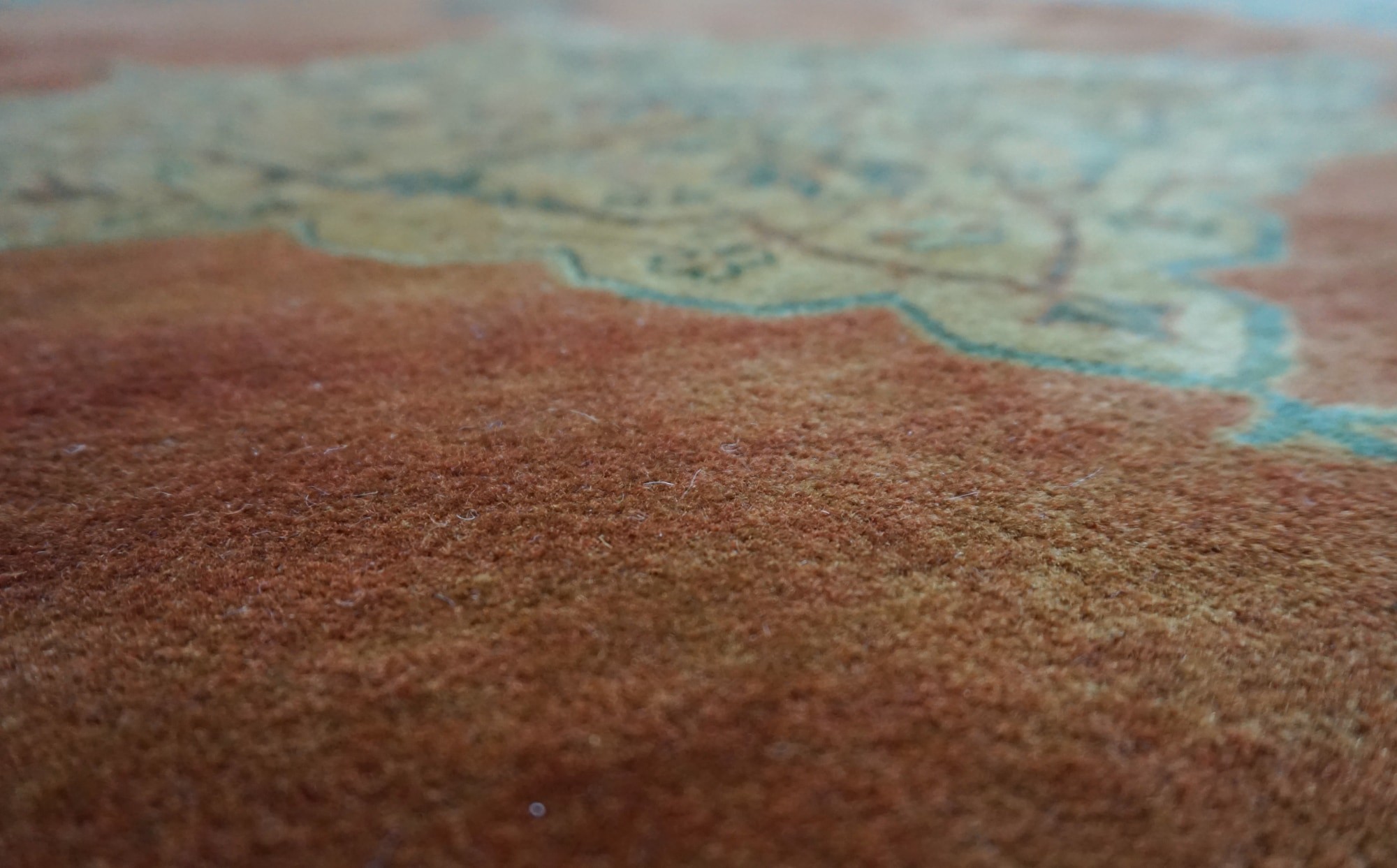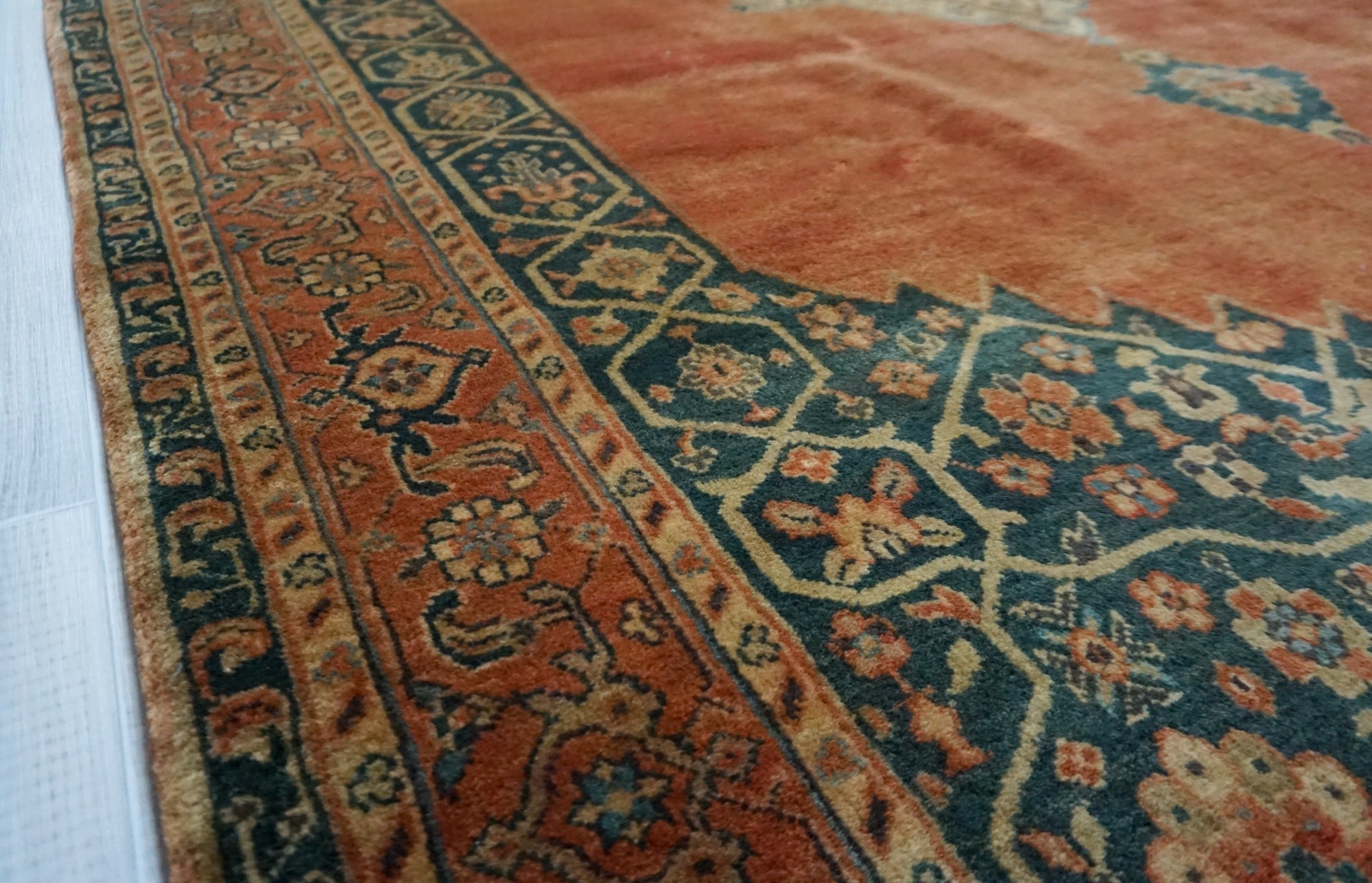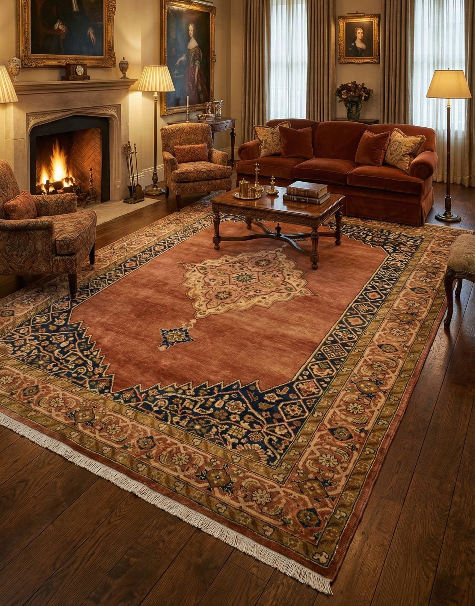 Поле ковра: Благородный оттенок "Faded Terracotta" (Выцветшая Терракота) или мягкий медный цвет. Поверхность имеет выразительный эффект "абраш" (игра полутонов), что придает изделию вид дорогого антиквариата, который благородно состарился. Контрастные акценты: Уголки (spandrels) и элементы бордюра выполнены в сложном цвете "Teal" (Цвет морской волны / Глубокий сине-зеленый). Это сочетание теплой терракоты и прохладной бирюзы является одним из самых гармоничных в дизайне интерьеров. Узор: Классическая медальонная композиция. Большой центральный медальон в песочно-бежевых тонах с геометрическими элементами символизирует солнце или вселенную и фокусирует взгляд на центре помещения.