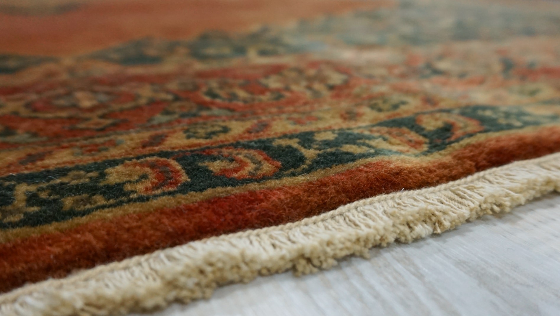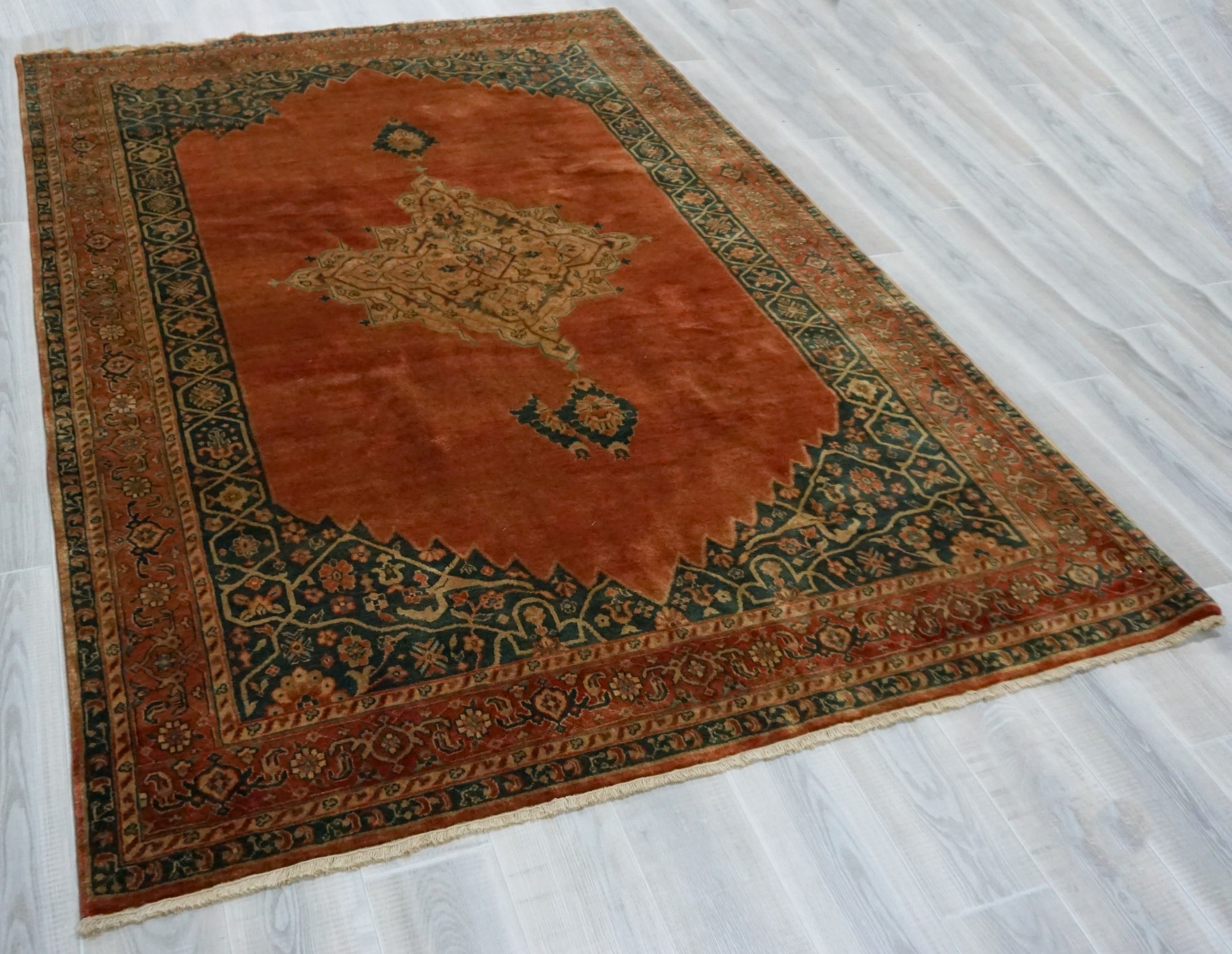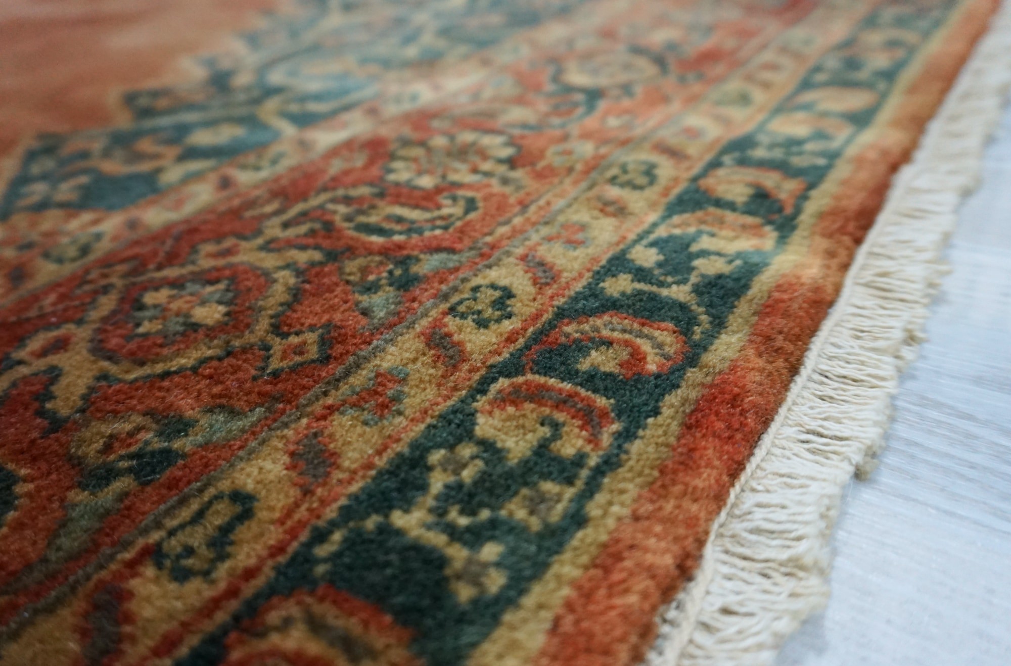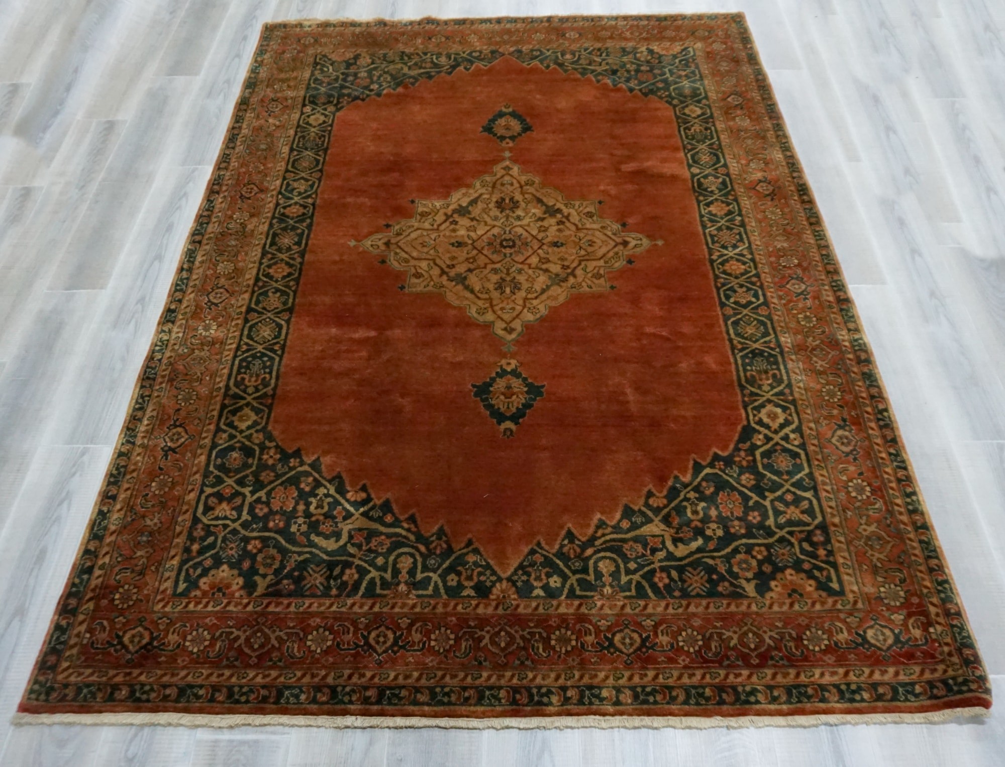 Поле ковра: Благородный оттенок "Faded Terracotta" (Выцветшая Терракота) или мягкий медный цвет. Поверхность имеет выразительный эффект "абраш" (игра полутонов), что придает изделию вид дорогого антиквариата, который благородно состарился. Контрастные акценты: Уголки (spandrels) и элементы бордюра выполнены в сложном цвете "Teal" (Цвет морской волны / Глубокий сине-зеленый). Это сочетание теплой терракоты и прохладной бирюзы является одним из самых гармоничных в дизайне интерьеров. Узор: Классическая медальонная композиция. Большой центральный медальон в песочно-бежевых тонах с геометрическими элементами символизирует солнце или вселенную и фокусирует взгляд на центре помещения.