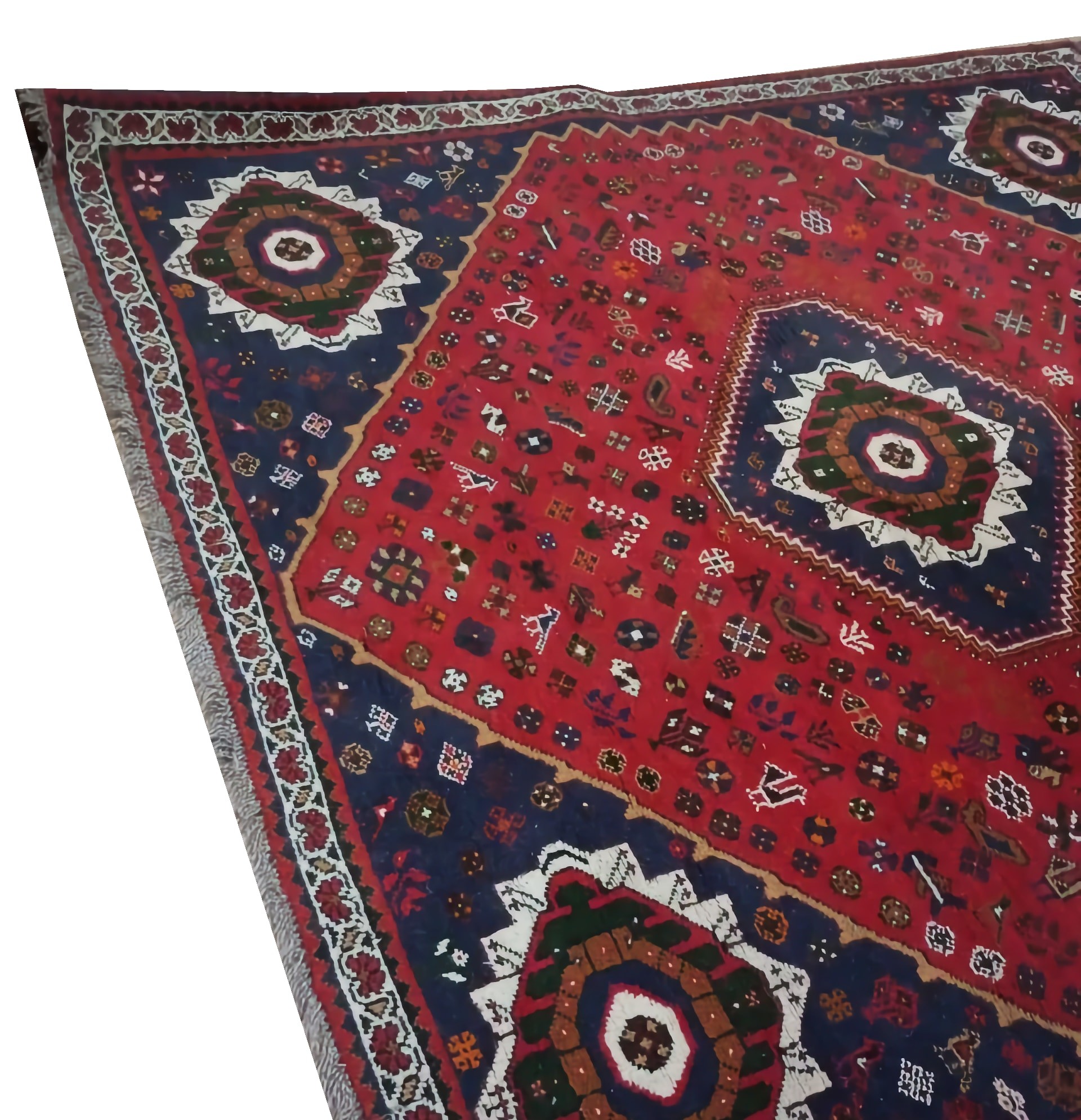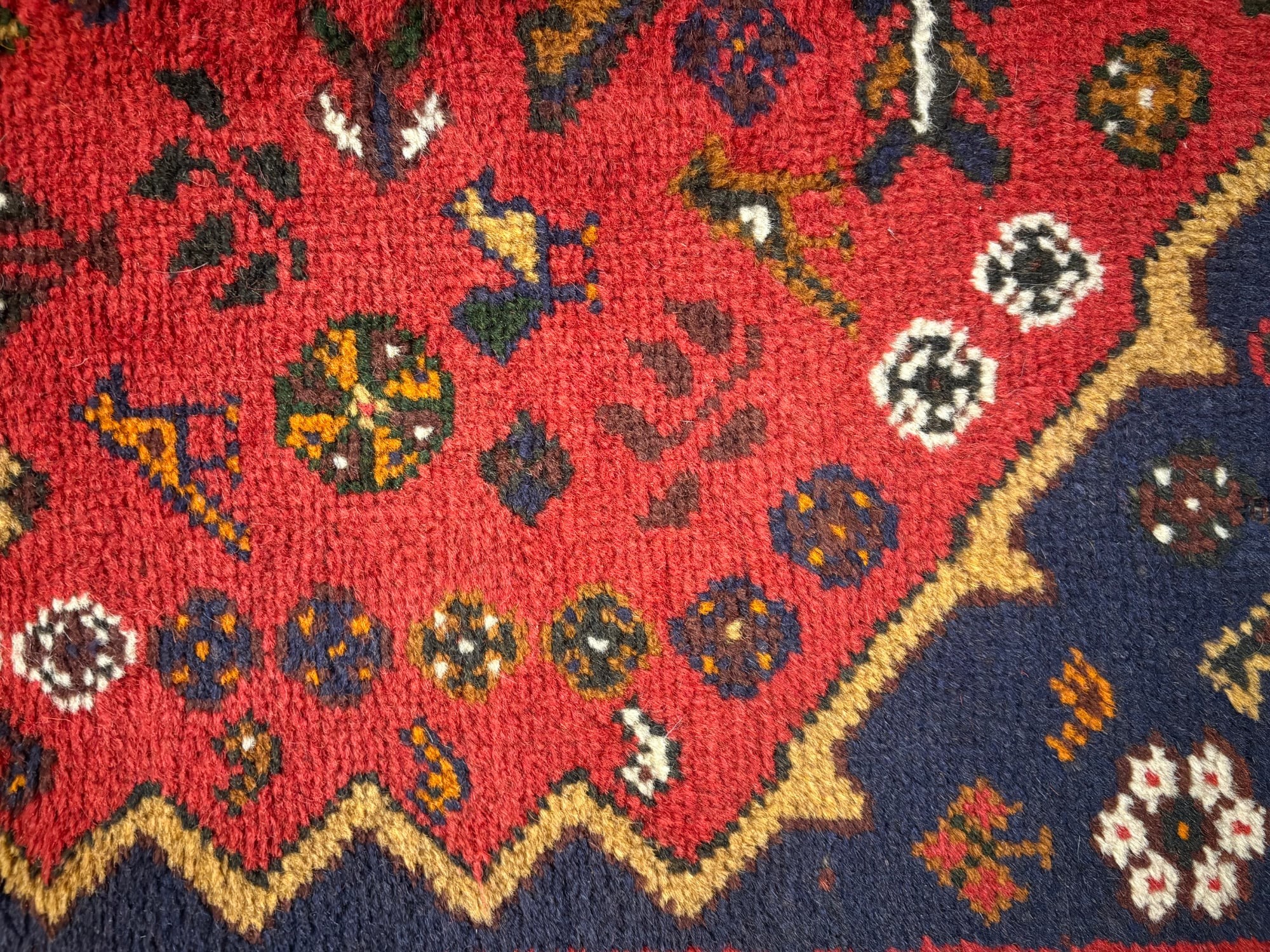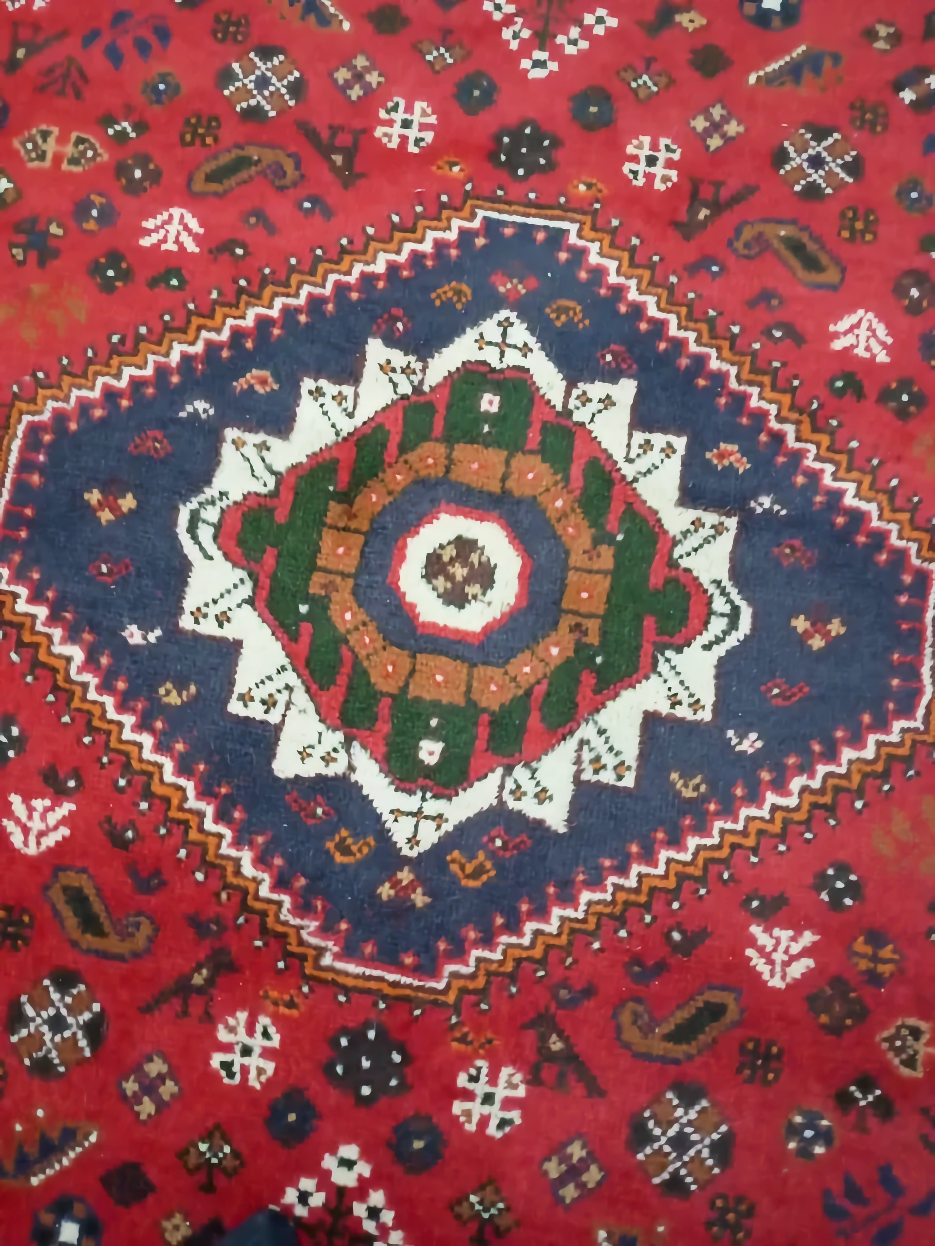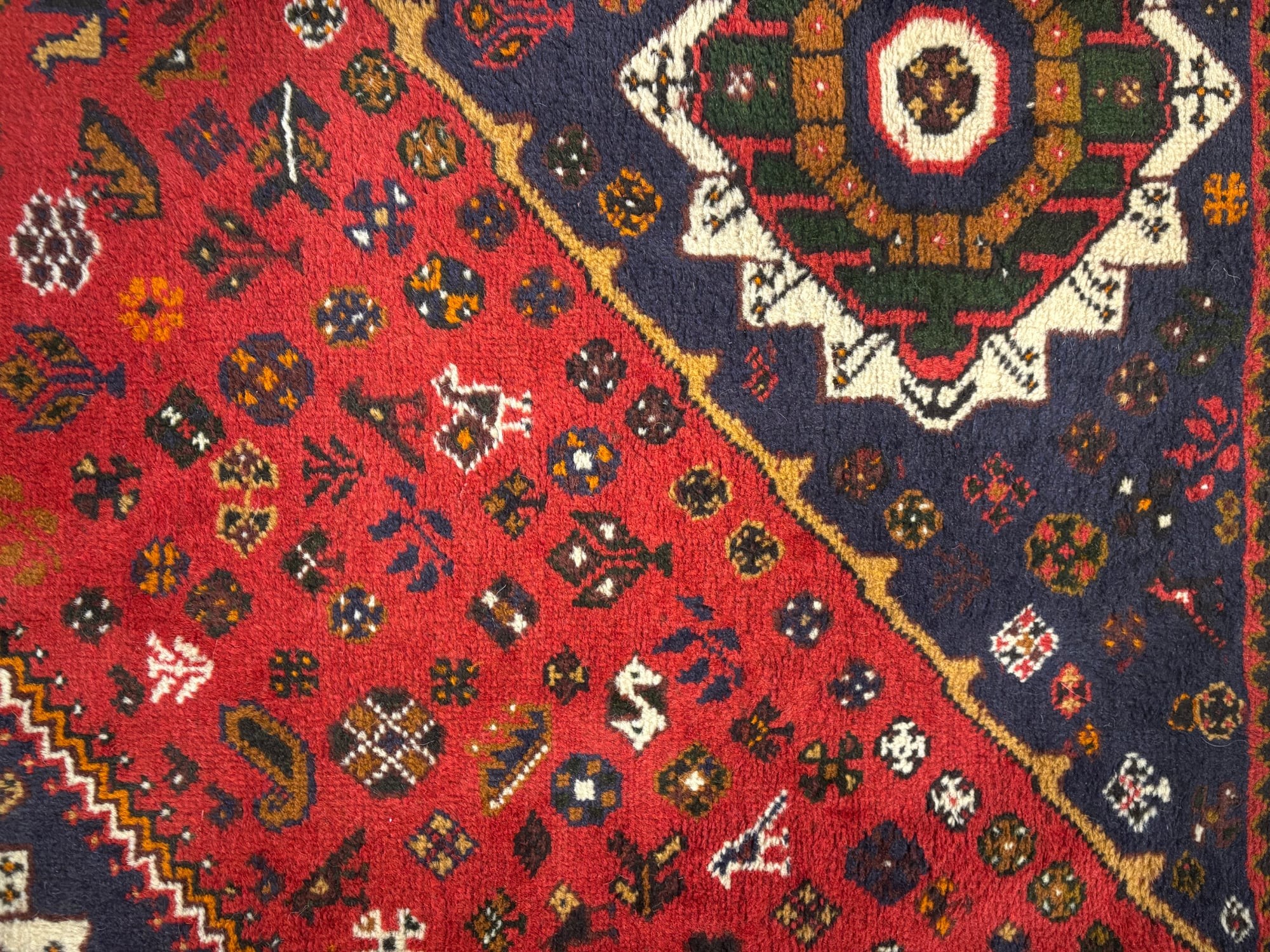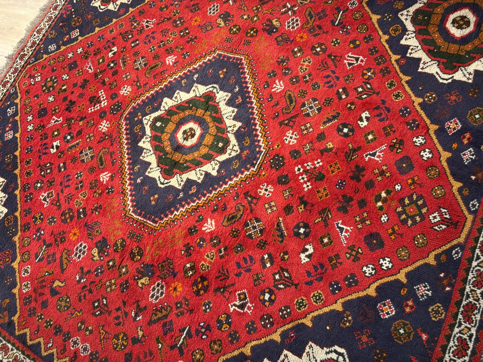 Унікальний візерунок: Центральне поле насиченого рубінового кольору прикрашене трьома концентричними медальйонами геометричної форми. Все поле килима густо всіяне дрібними символічними елементами: стилізованими квітами, зірками та, що особливо характерно для Ширазів, зображеннями птахів та тварин. Кожен такий елемент — це стародавній символ-оберіг.