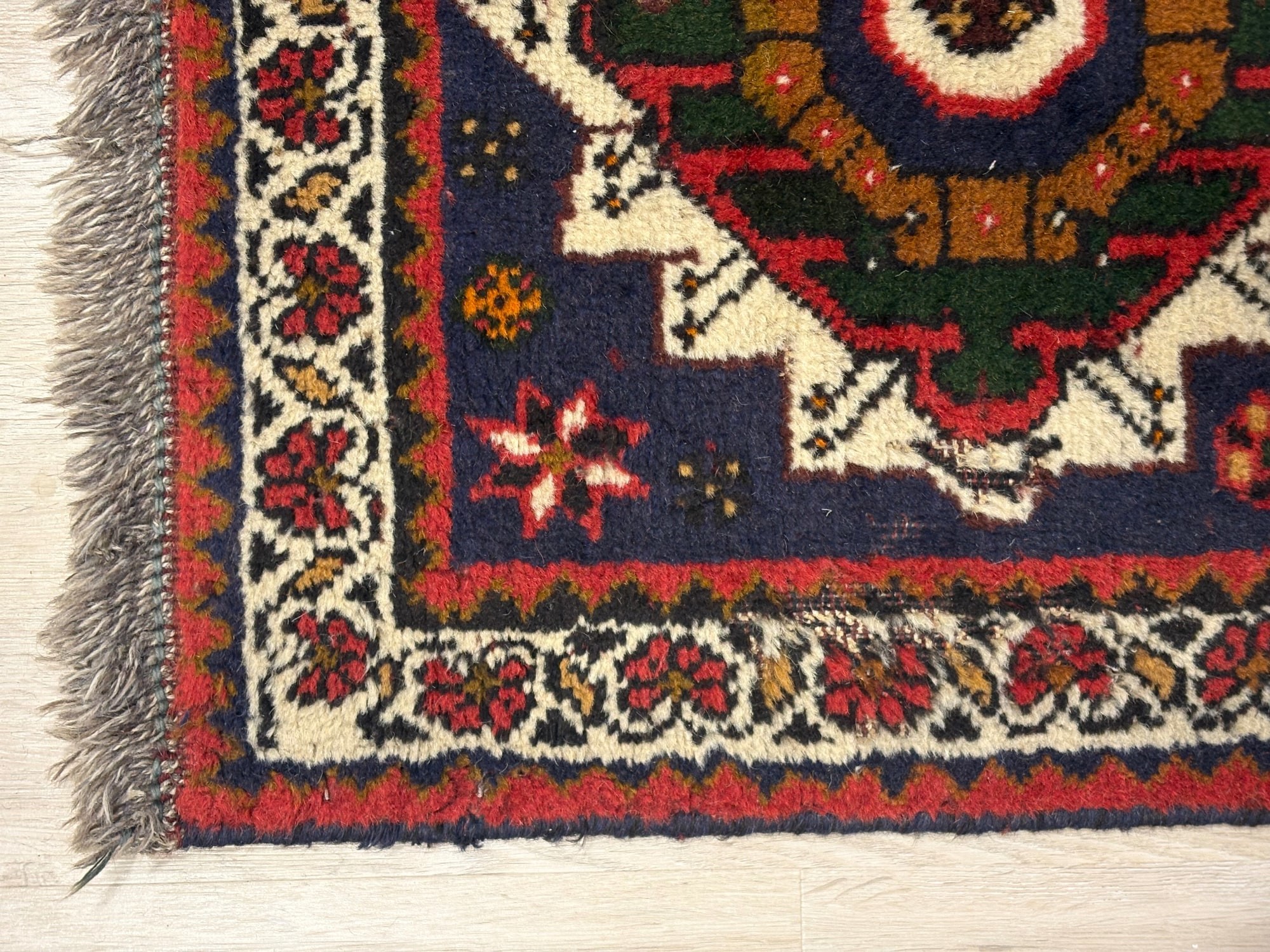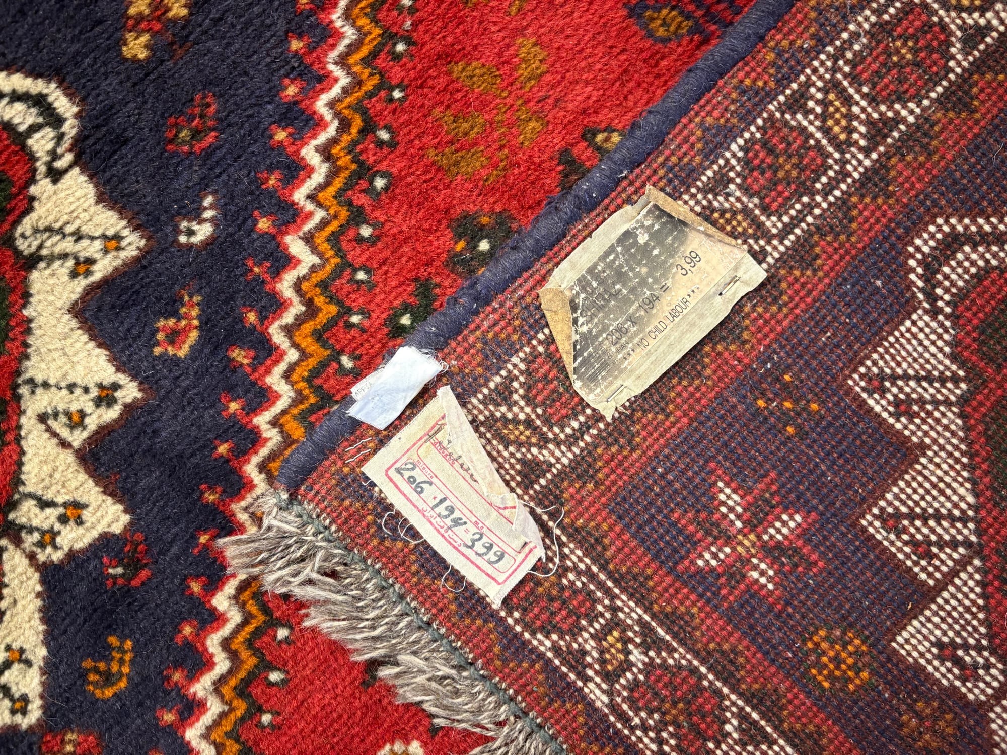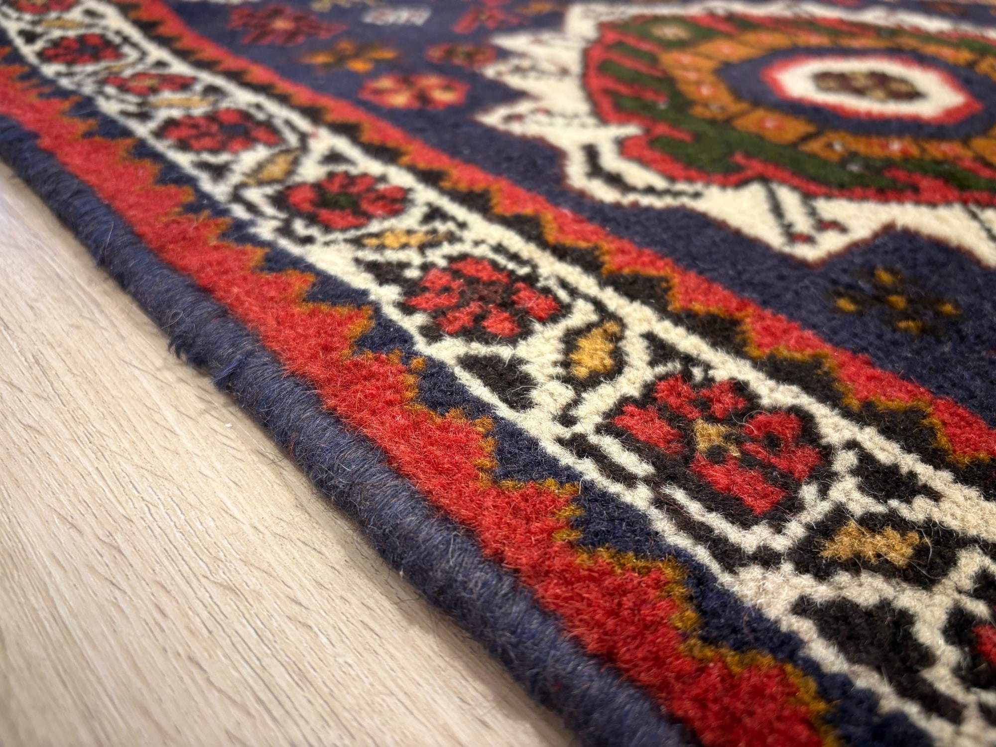 Технічні характеристики: Розмір: 206 × 194 см (майже квадратна форма, що є рідкістю і додає цінності). Робота: 100% ручна робота (Hand knotted). Щільність: Близько 90 000 вузлів на м². Це оптимальна щільність для племінного килима, що забезпечує йому м'якість, але водночас високу зносостійкість. Матеріал: Натуральна високоякісна вовна. Вона має природний блиск, стійка до забруднень і з роками стає лише красивішою.