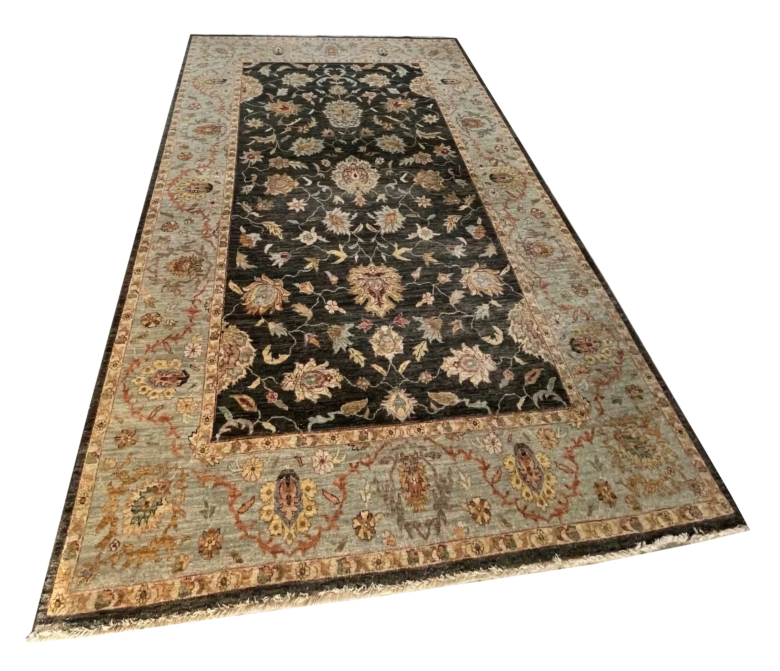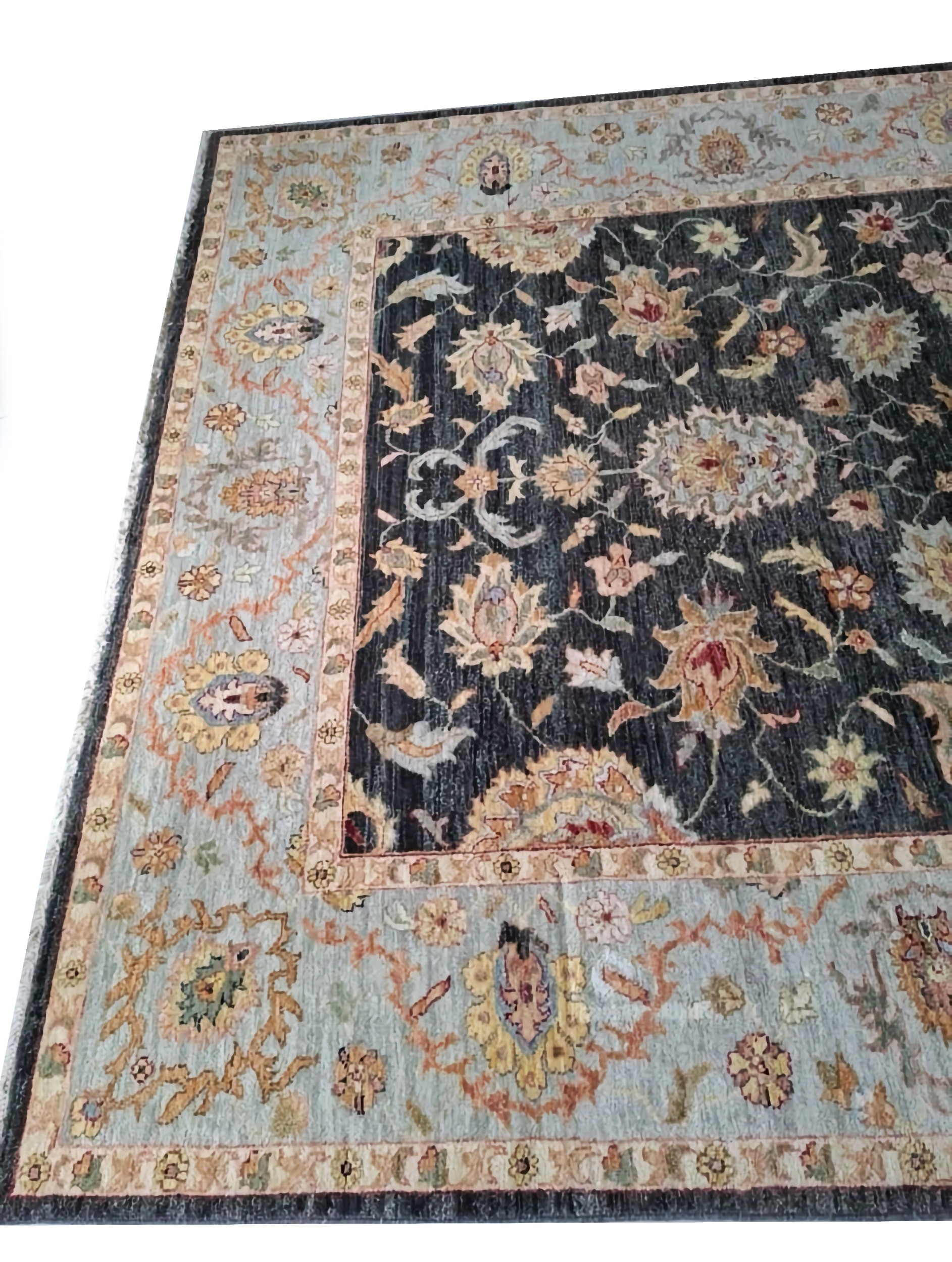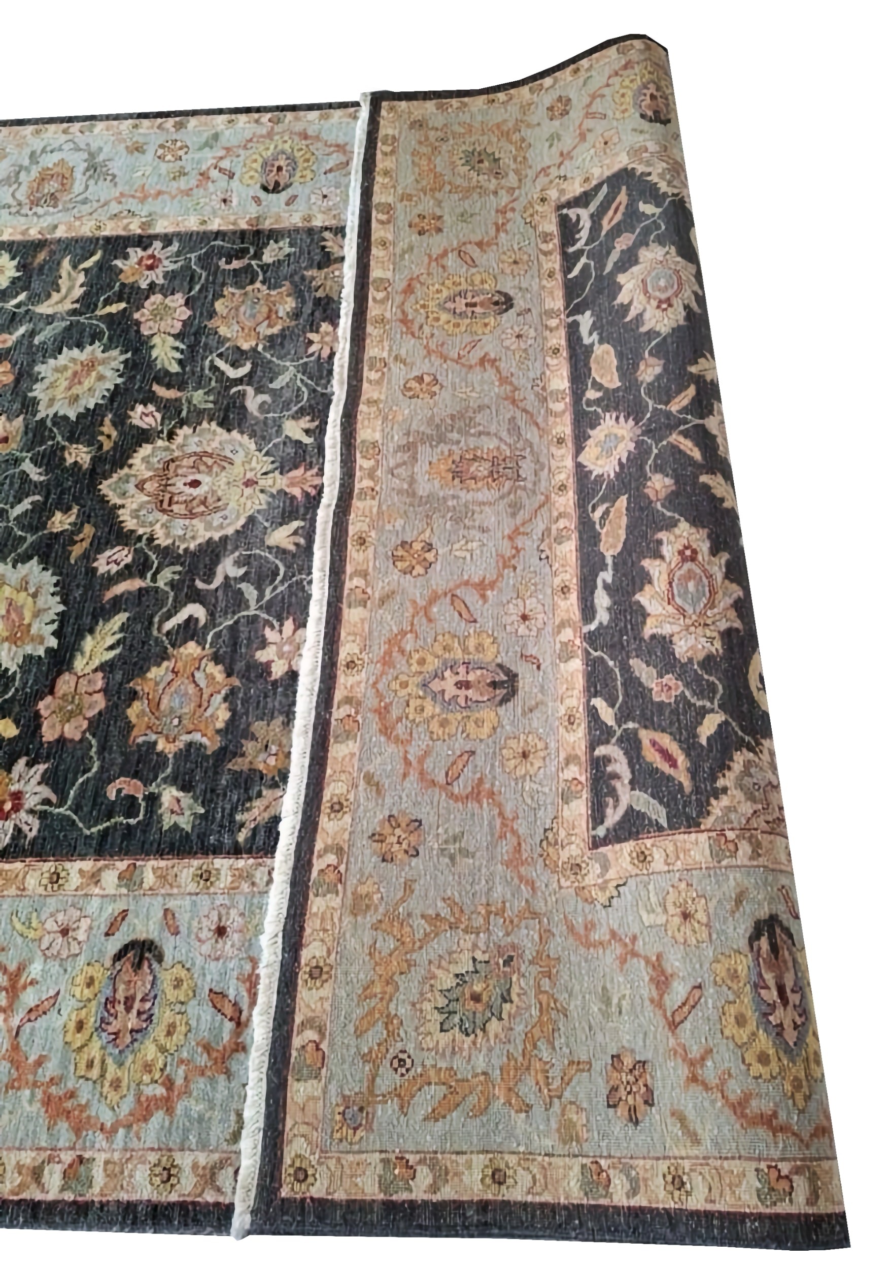 Вишуканий килим Ziegler, виготовлений вручну в Пакистані. Килиму близько 40 років, він зберігся у відмінному стані, що свідчить про високу якість матеріалів і майстерність виконання. Центральне поле має глибокий графітовий (charcoal) відтінок, прикрашене витонченими квітковими мотивами у теплих тонах бежевого, золотистого та рожевого кольорів. Бордюр виконано у приглушеному сіро-блакитному відтінку (sage blue), який гармонійно поєднується з основним тлом і створює м’який, елегантний контраст.